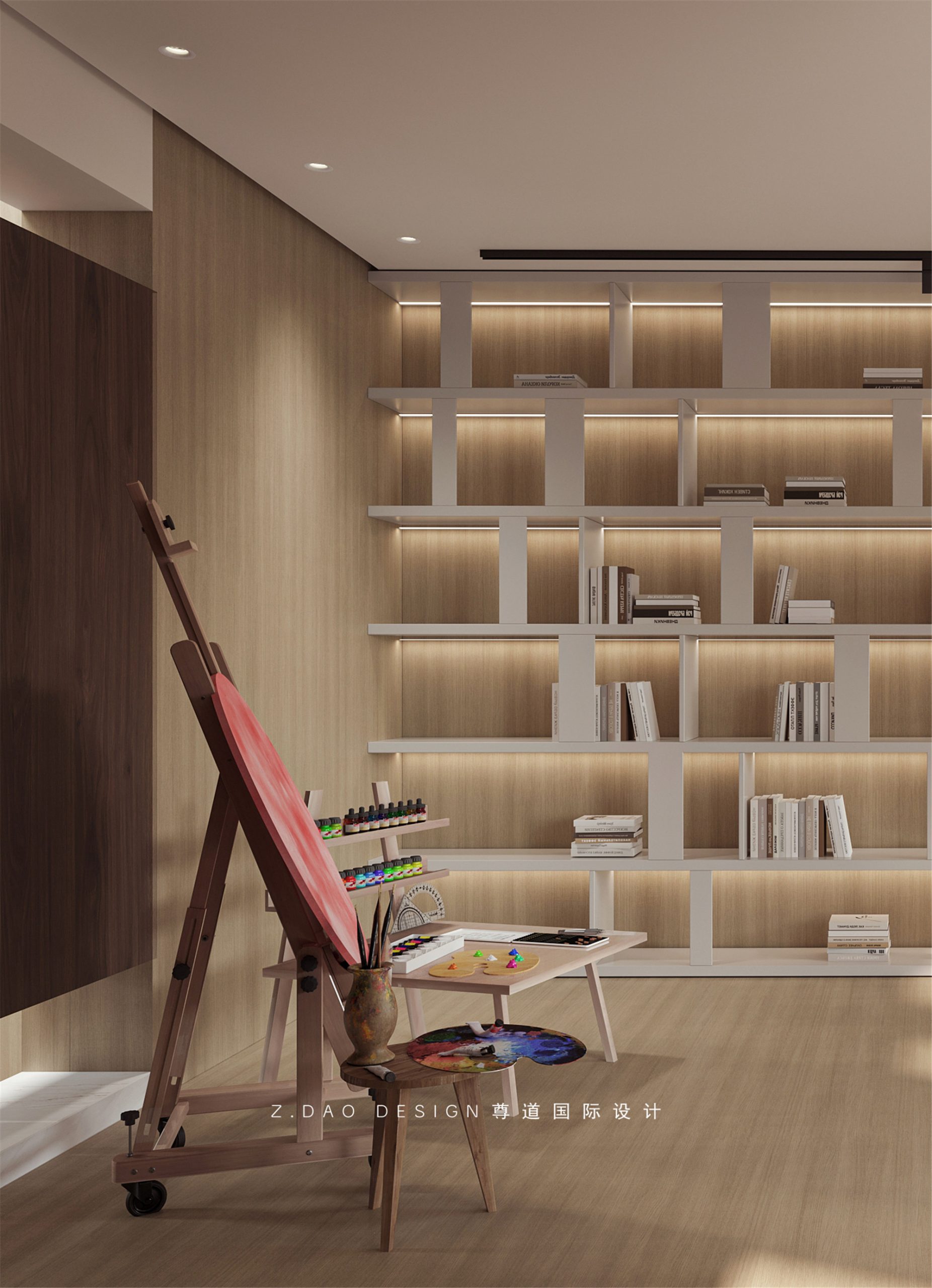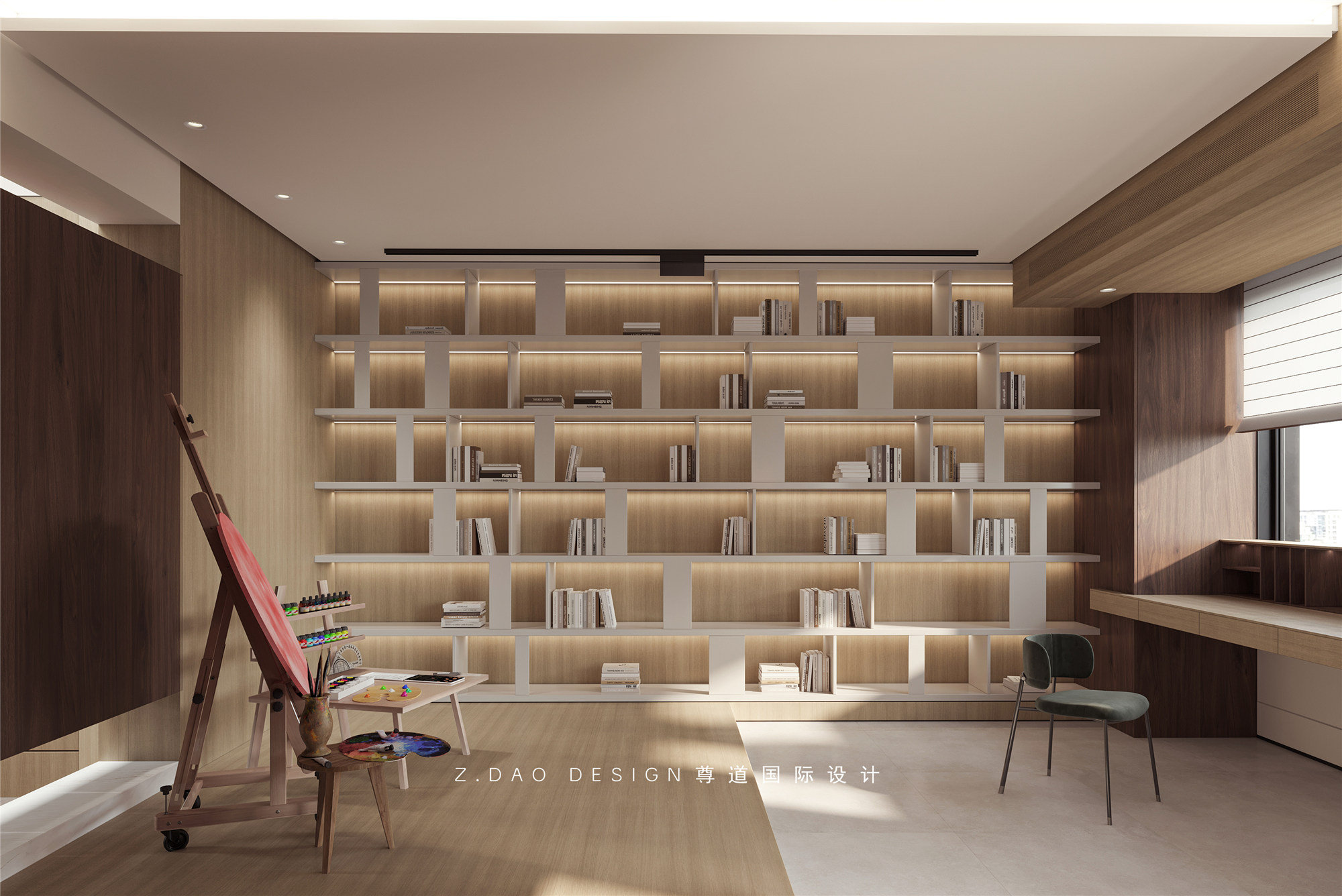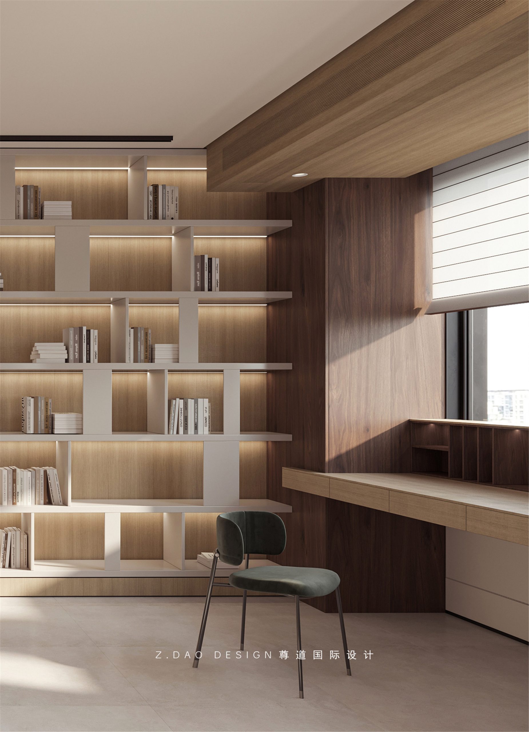 书房破除了传统的概念,形成了一个及办公、休憩与展示于一体的空间,设计师拆除空间中的非承重墙,打造一个开放式的空间,大面积的木色让人感到踏实而温暖,整面书柜提升空间文化气质。