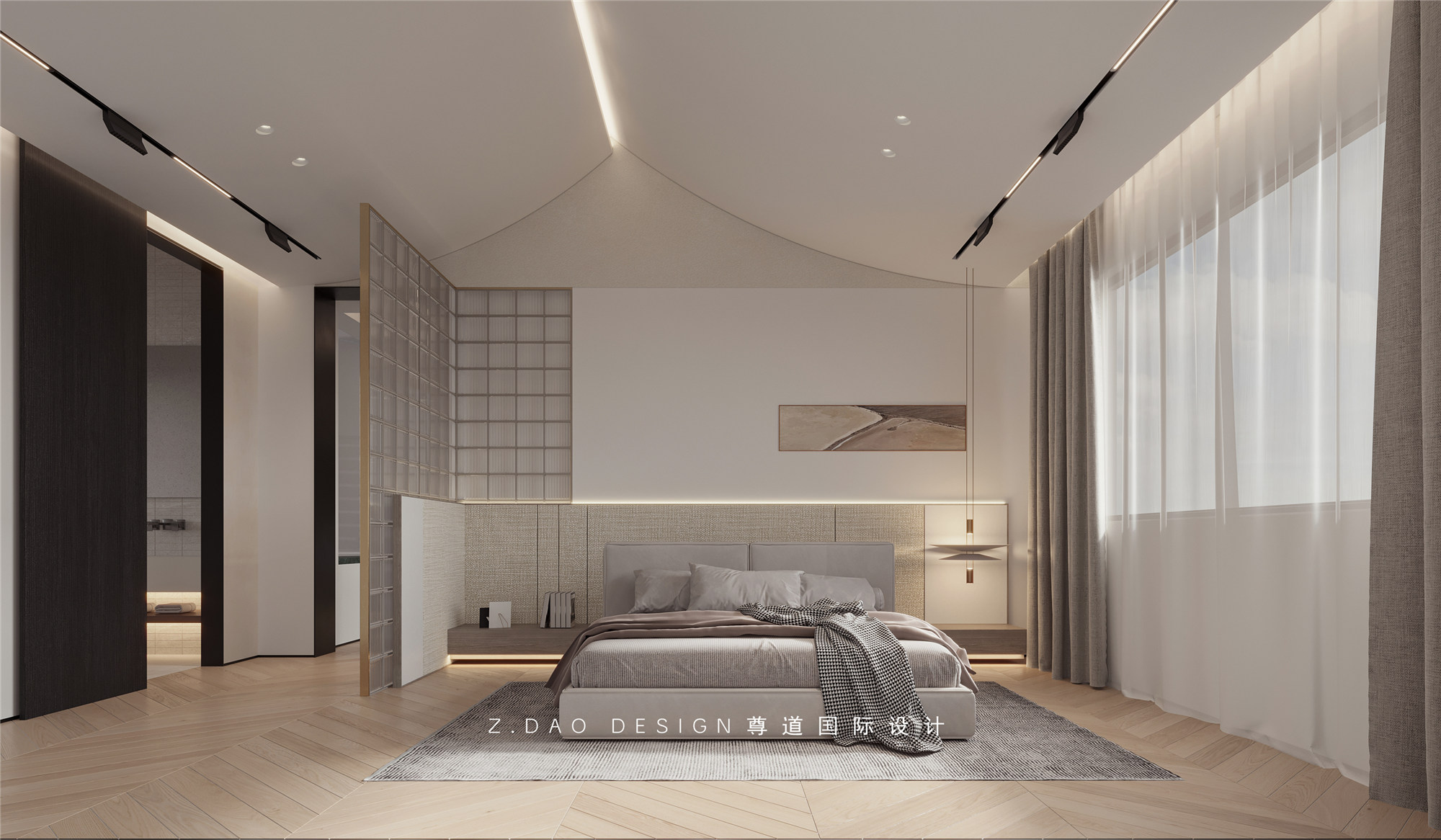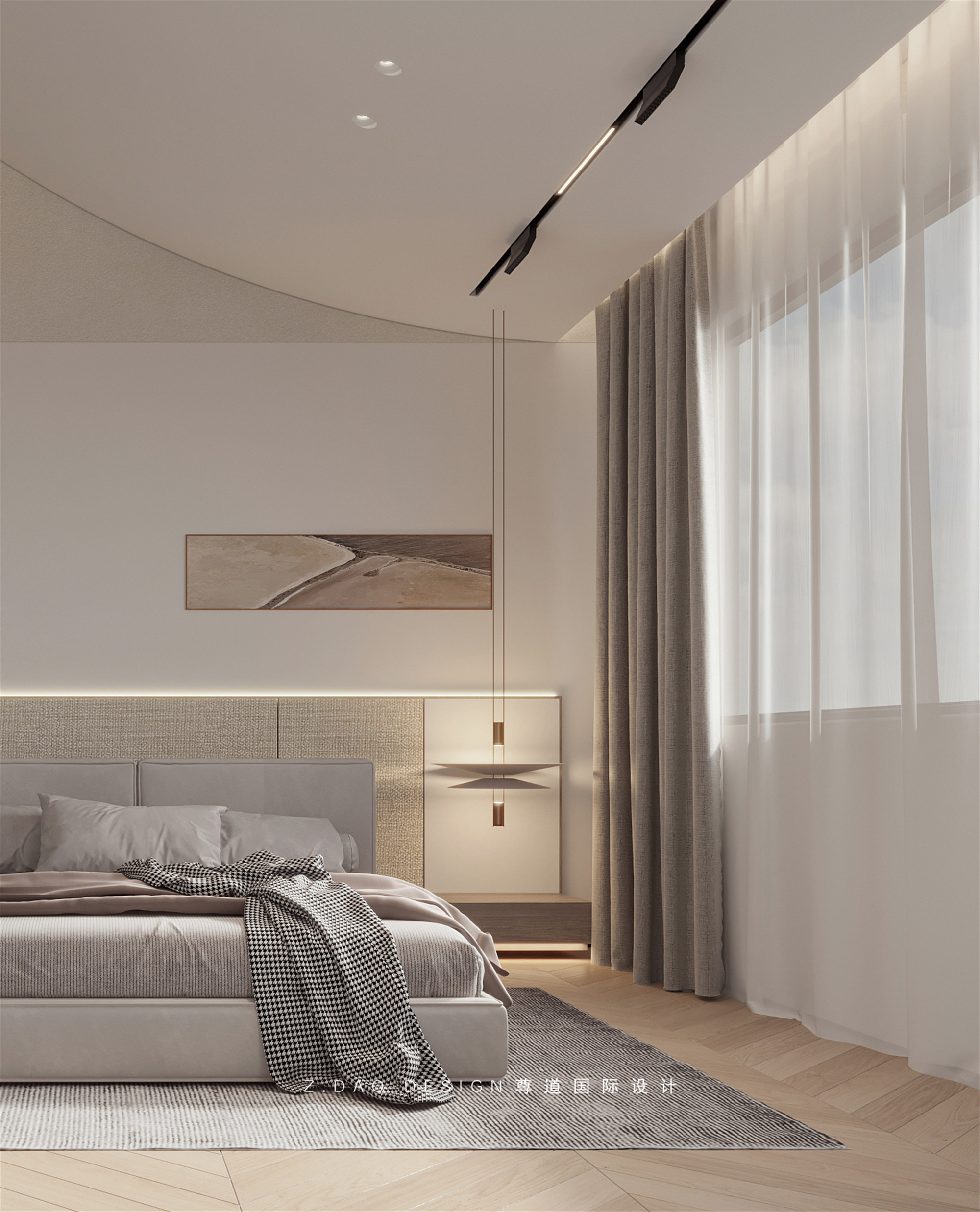 主卧套房空间面积较大,摒弃成品床搭配床头柜的传统形式,取而代之的是更具造型感的床头柜。艺术涂料包裹整个墙面,细腻的质感,丰富了简素的空间,床头不规则的硬包分割,有序的铺陈。