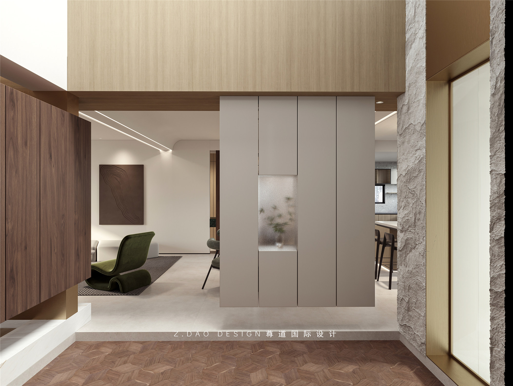 迎面而来的是一组悬浮收纳柜,柜体中间部分做磨砂玻璃,既遮挡住门外的视线,同时满足餐厅的储物需求,形成一个独立玄关。