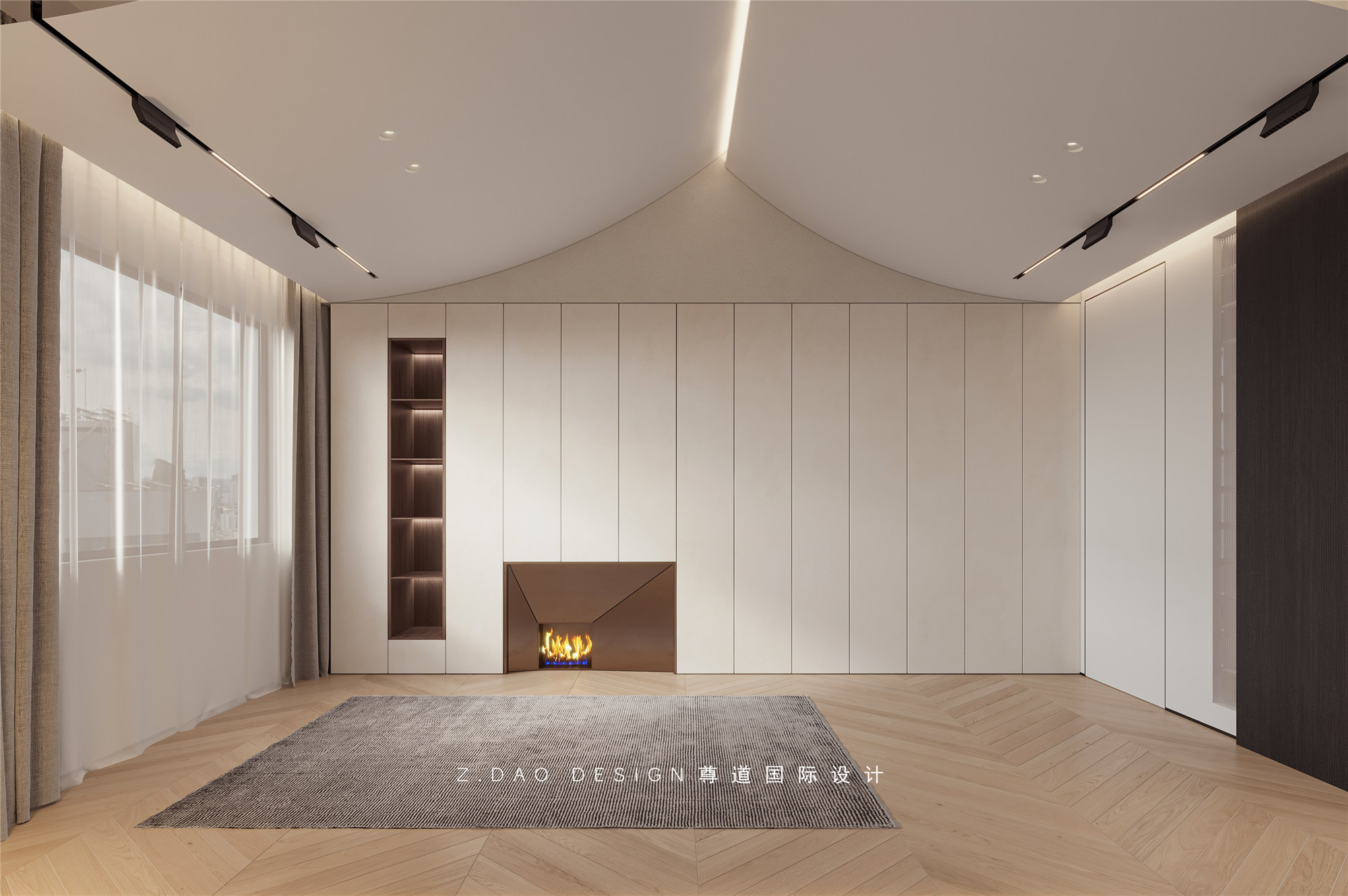 床尾整面的衣柜满足业主日常储物需求,雾化壁炉带来似火焰的暖意,雾气不断生长、摇曳,丰富艺术感的同时也能带来更多视觉美和趣味性,令空间滋生出内生和外延之间的张力。书页型吊顶完美解决原始空间梁体过于杂乱的问题,美观使用。