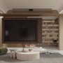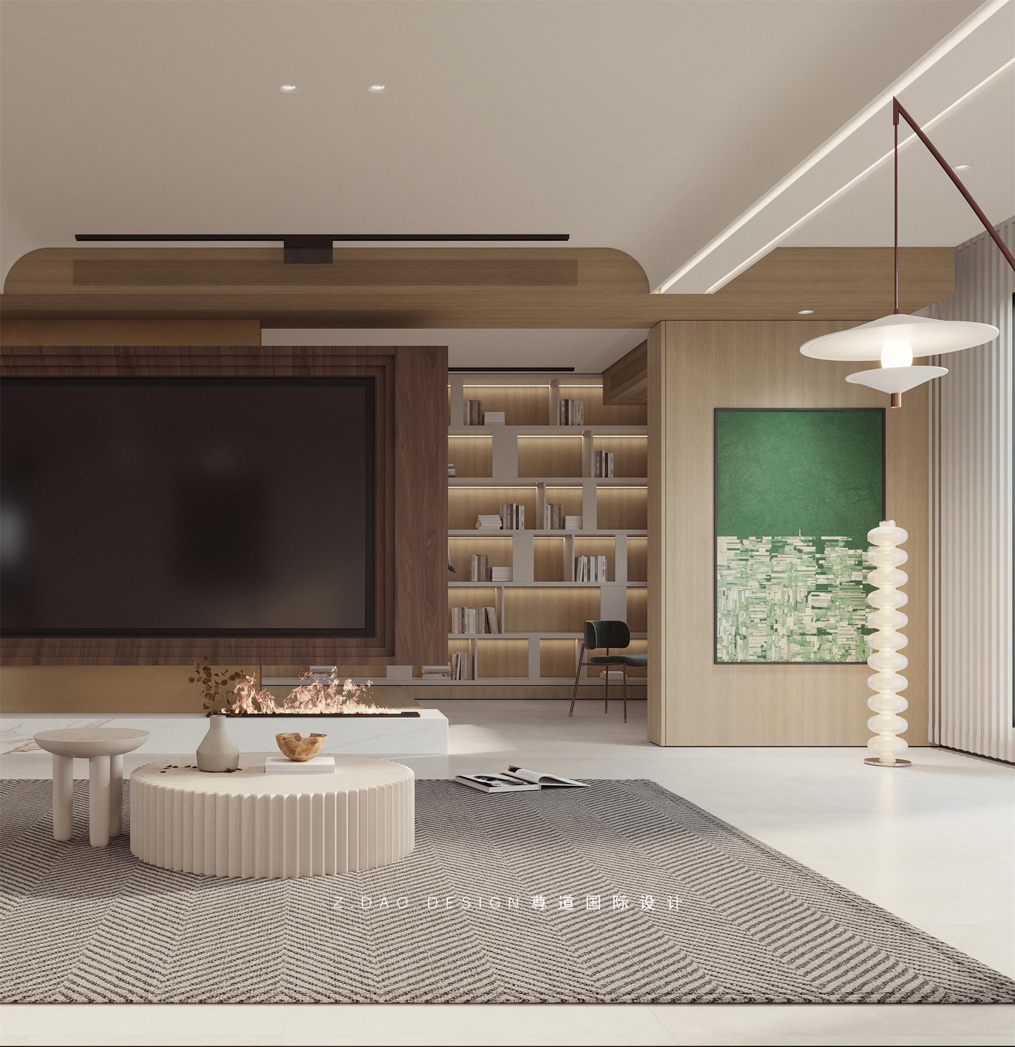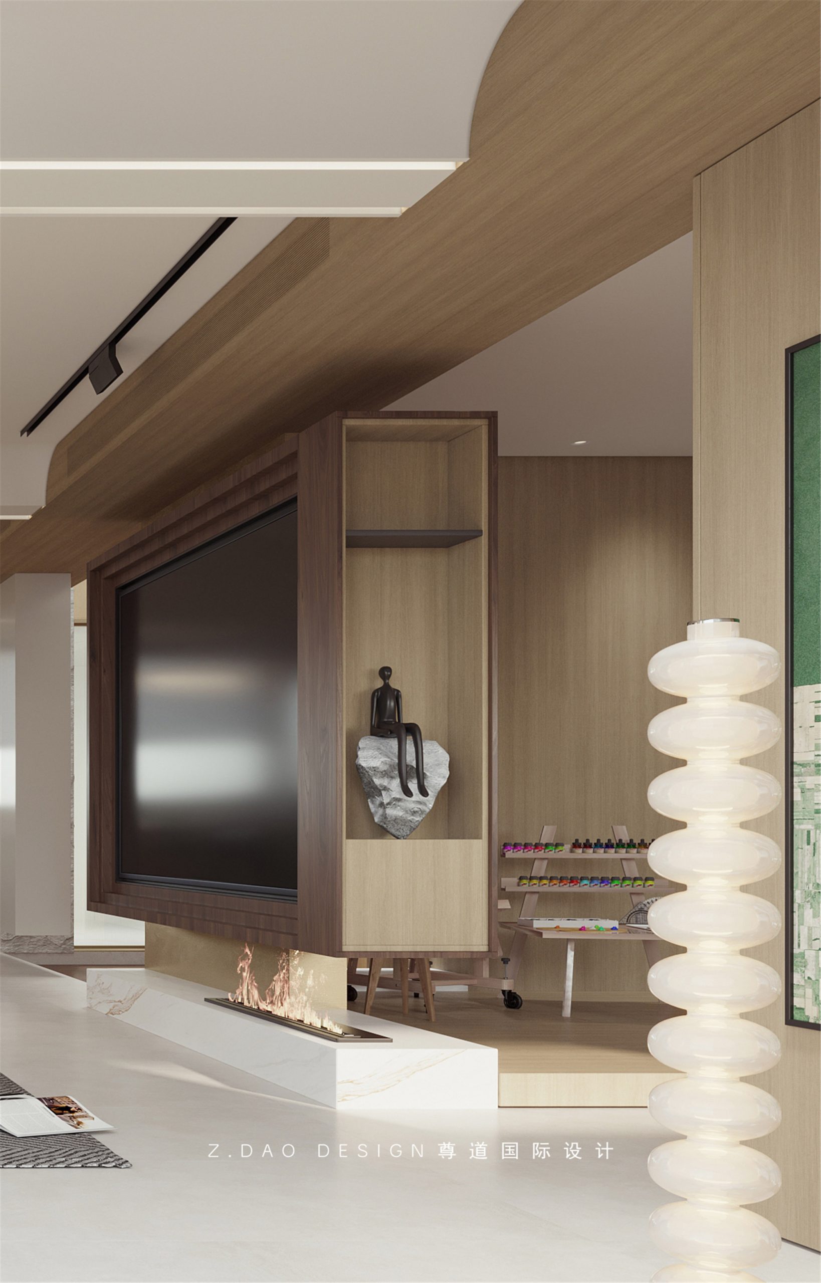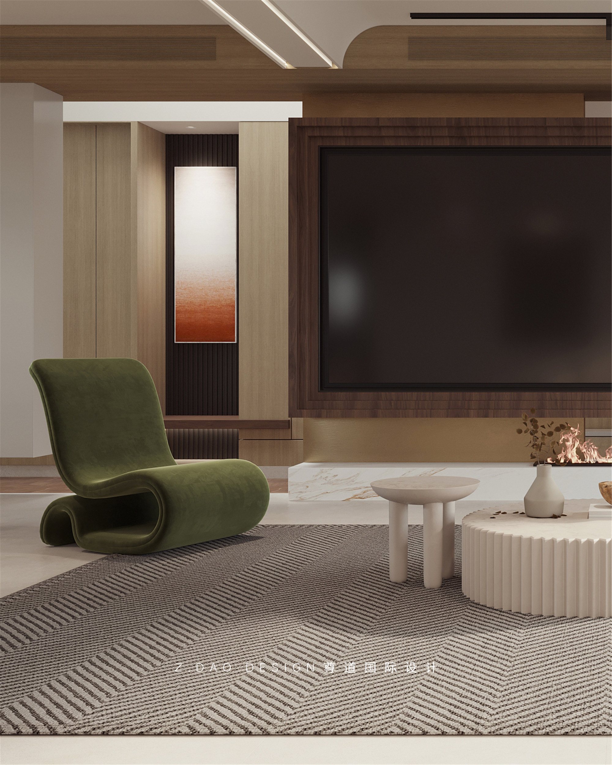 木饰面与岩板的结合,温润之中增添质感,悬浮设计既不会产生压迫感,也让空间更具通透感,搭配底部雾化壁炉,更具设计感。