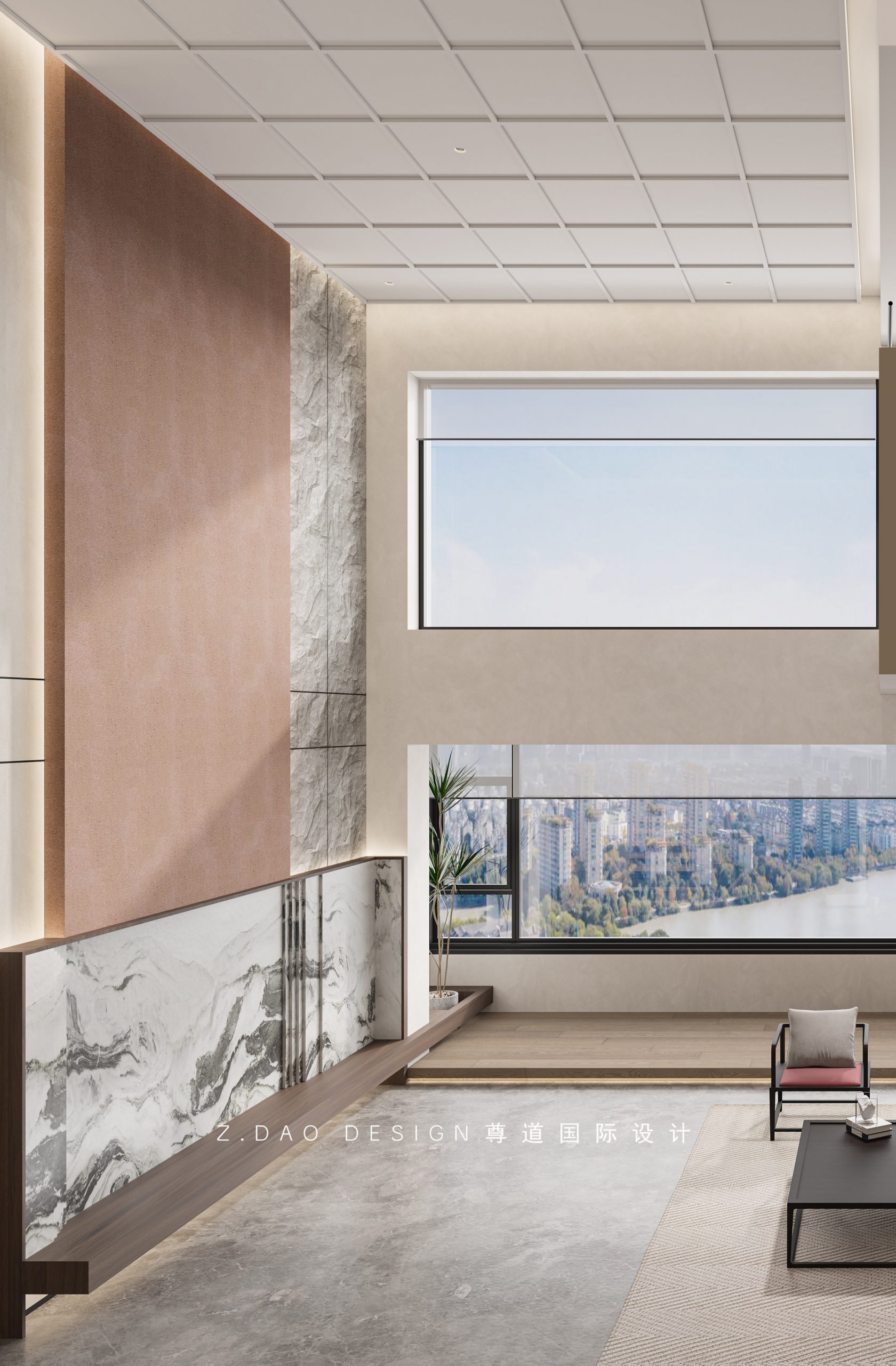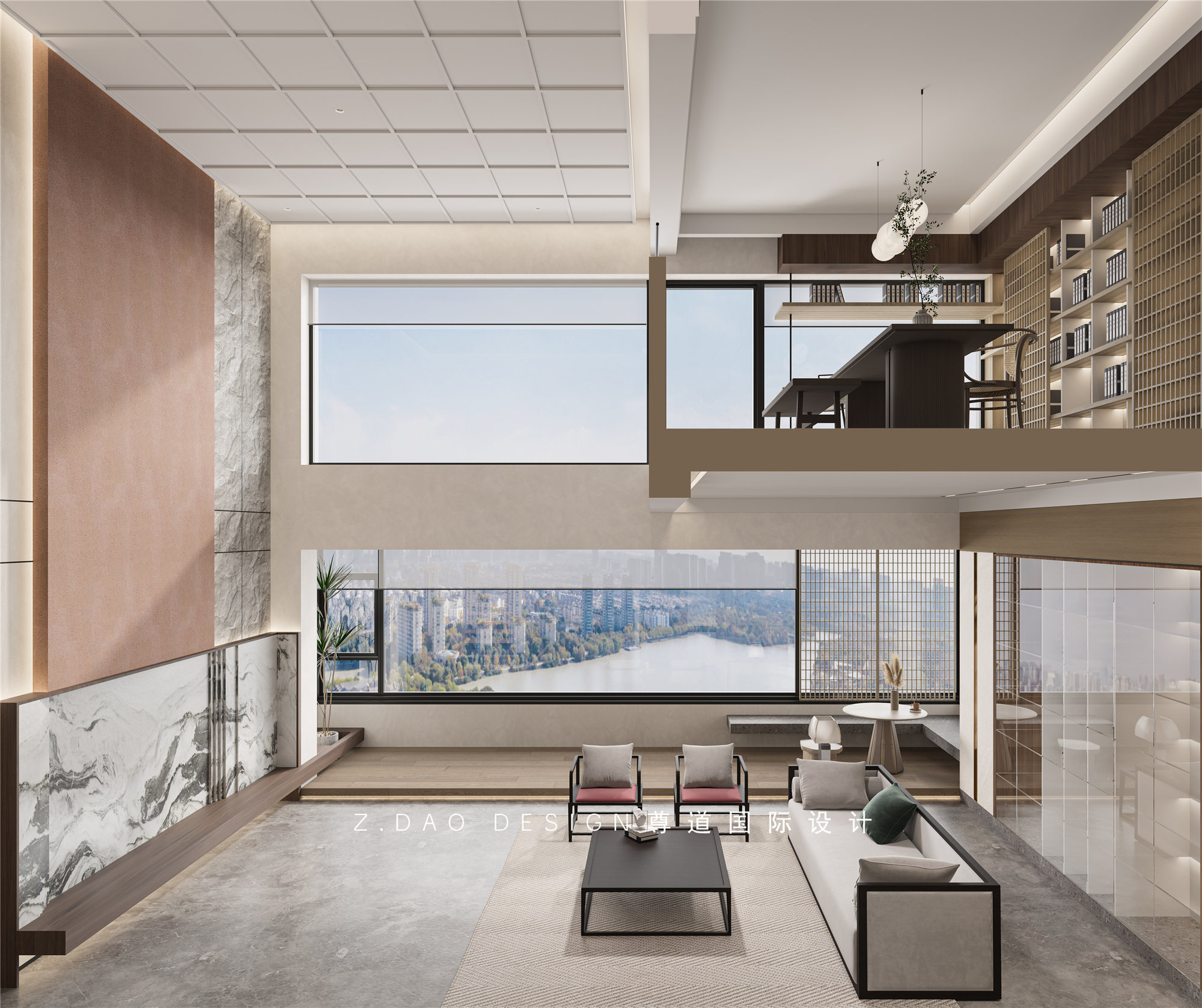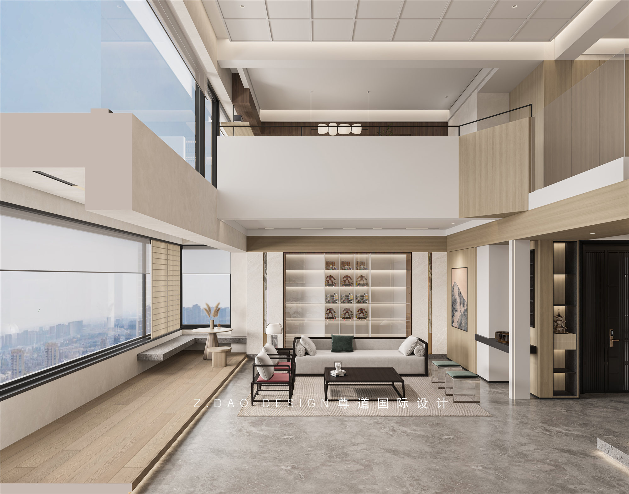 客厅挑空区域的吊顶采用中式元素平旗吊顶,在现代元素中增添了少许中式元素。