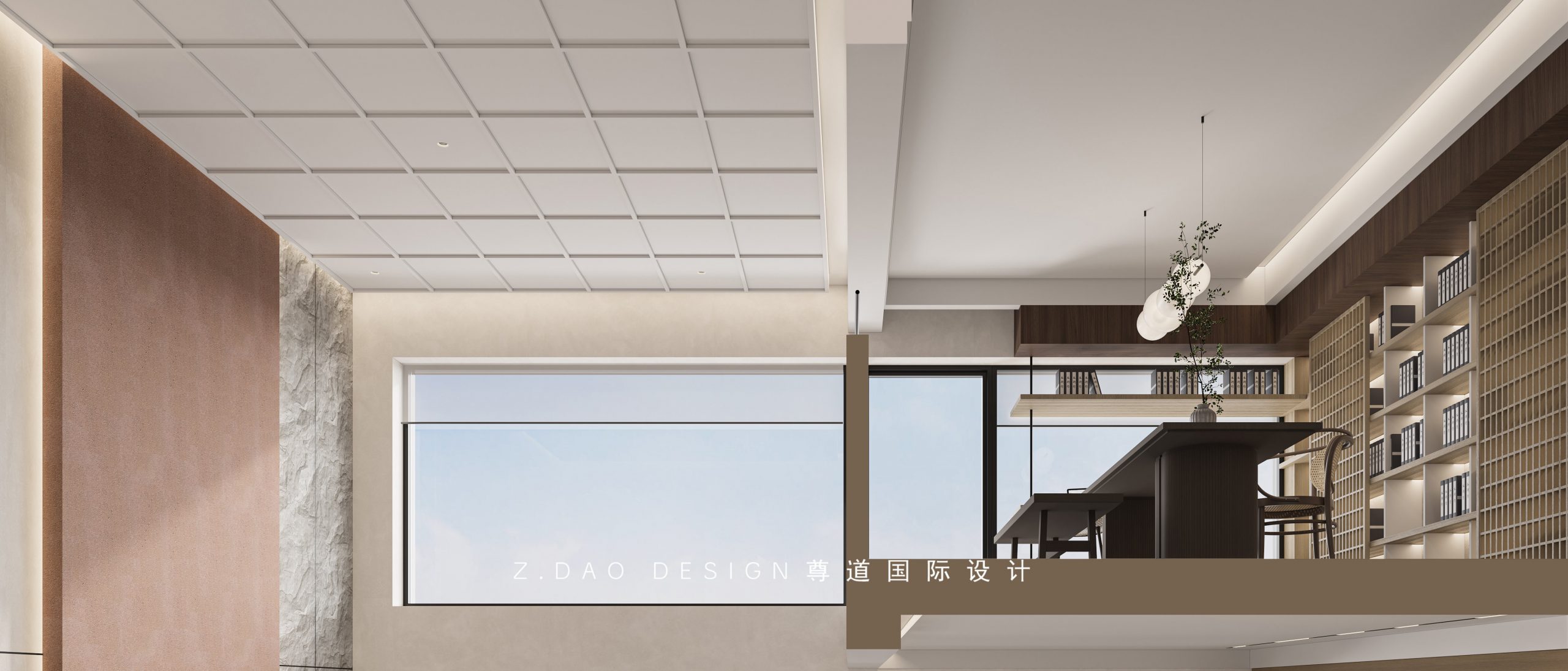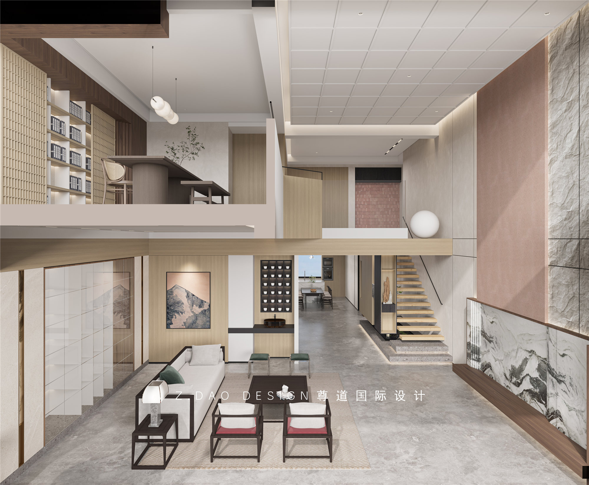 挑空区域进行局部现浇留给书房,书房破除了传统的概念,形成了一个及办公、休憩与展示于一体的空间,打造一个开放式的空间,大面积的木色让人感到踏实而温暖,整面书柜提升空间文化气质。