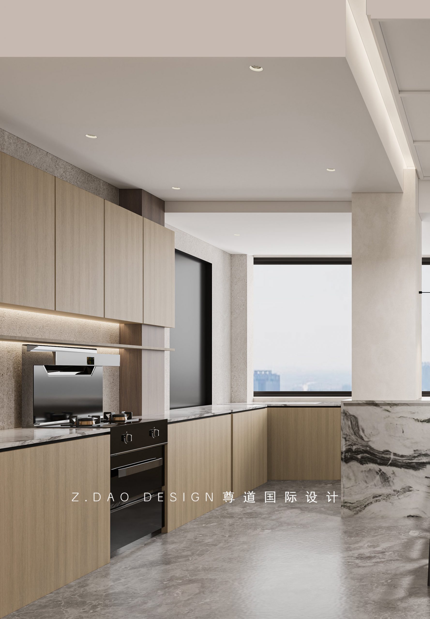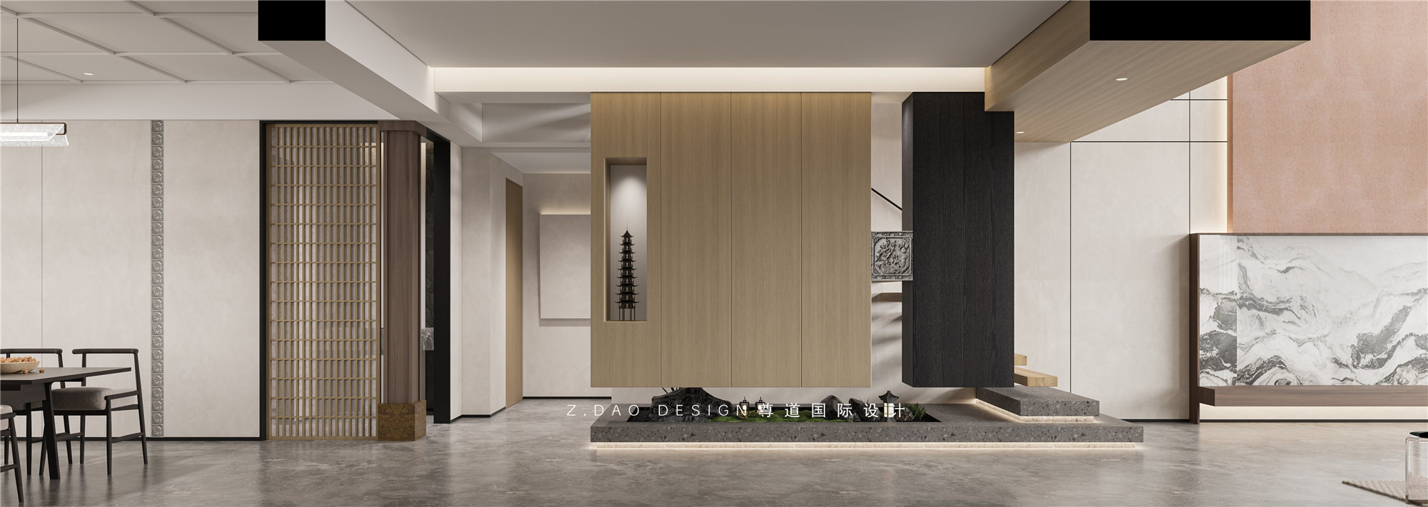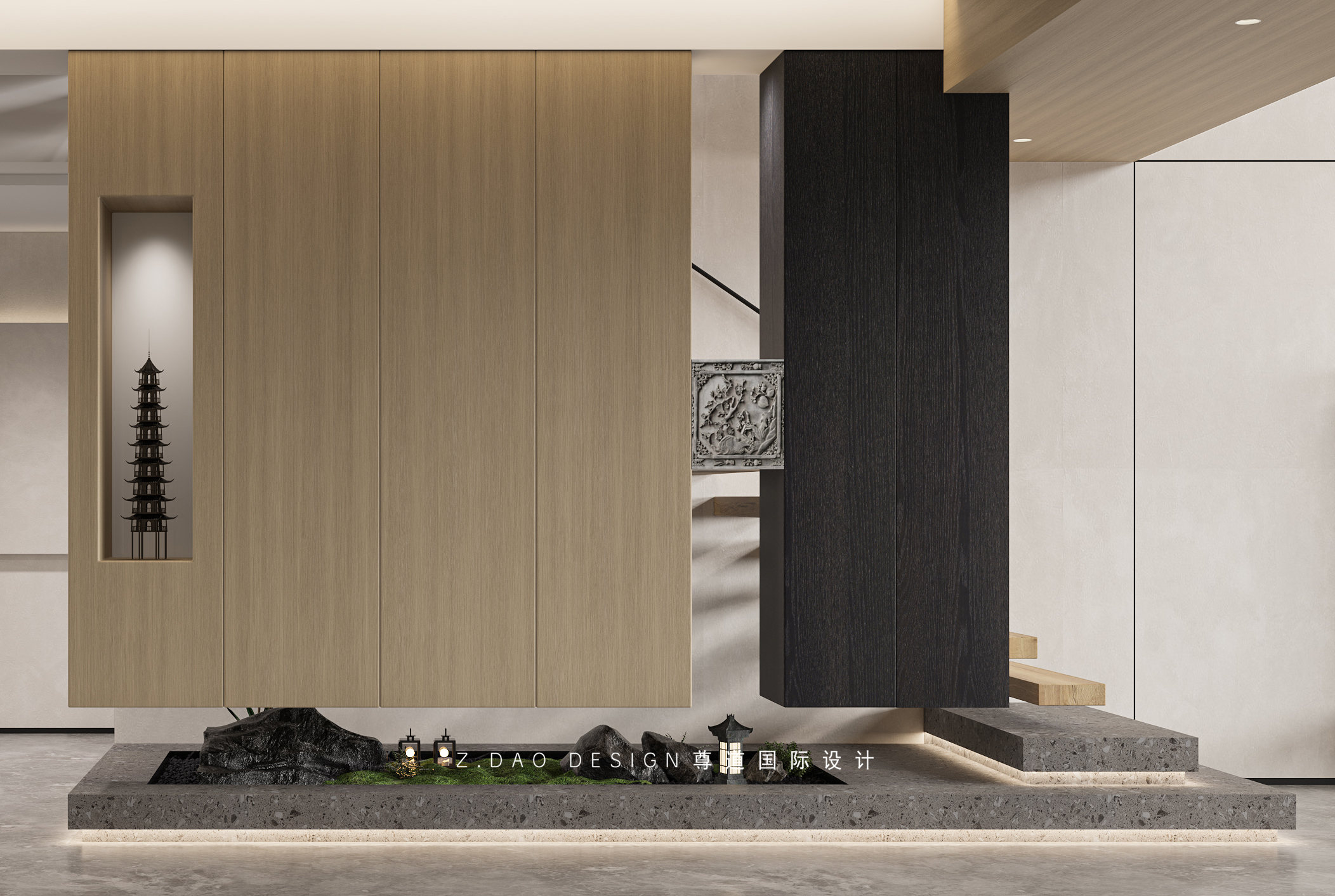整体的设计,采用了定制天然岩板+天然石皮来奠定主基调,通过艺术涂料及烟熏橡木地台调配使空间成为抢眼的视觉焦点。