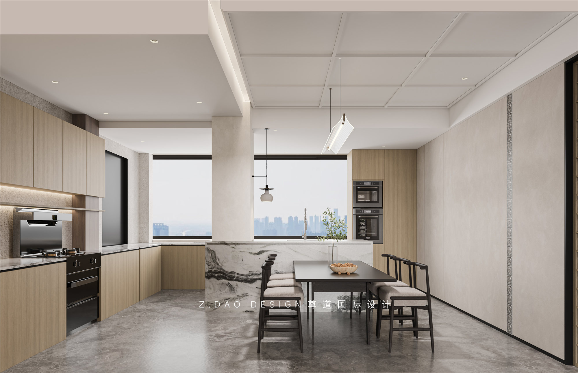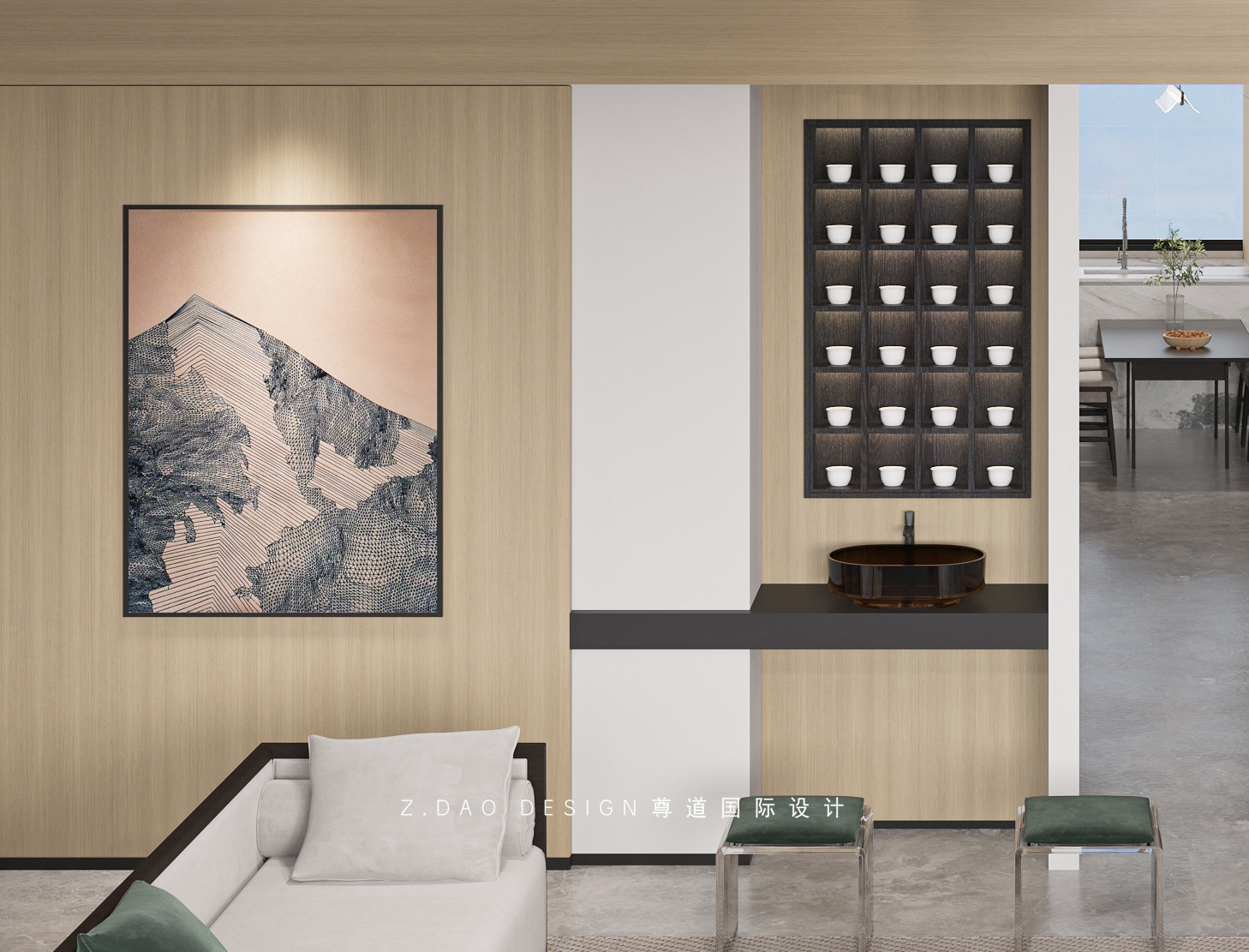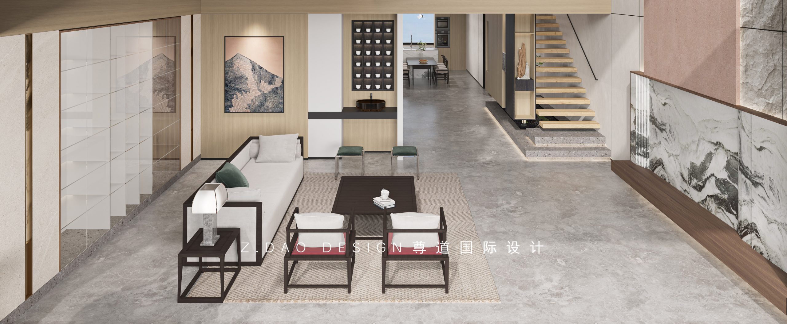 整体的设计,采用了定制天然岩板+天然石皮来奠定主基调,通过艺术涂料及烟熏橡木地台调配使空间成为抢眼的视觉焦点。