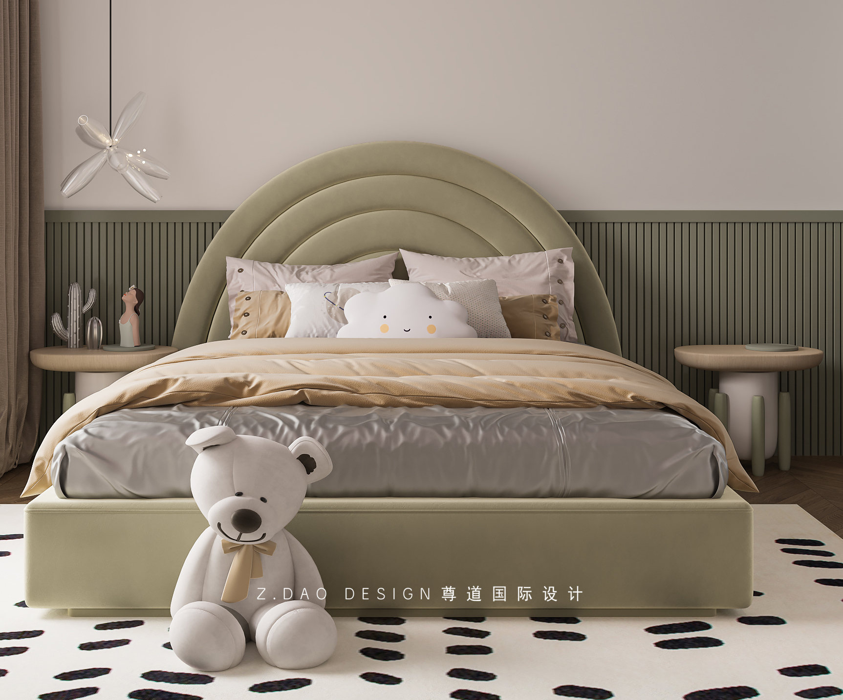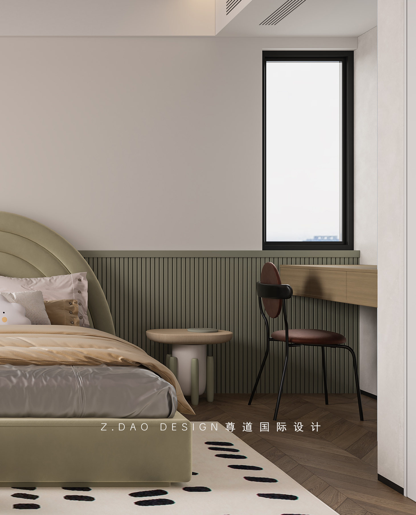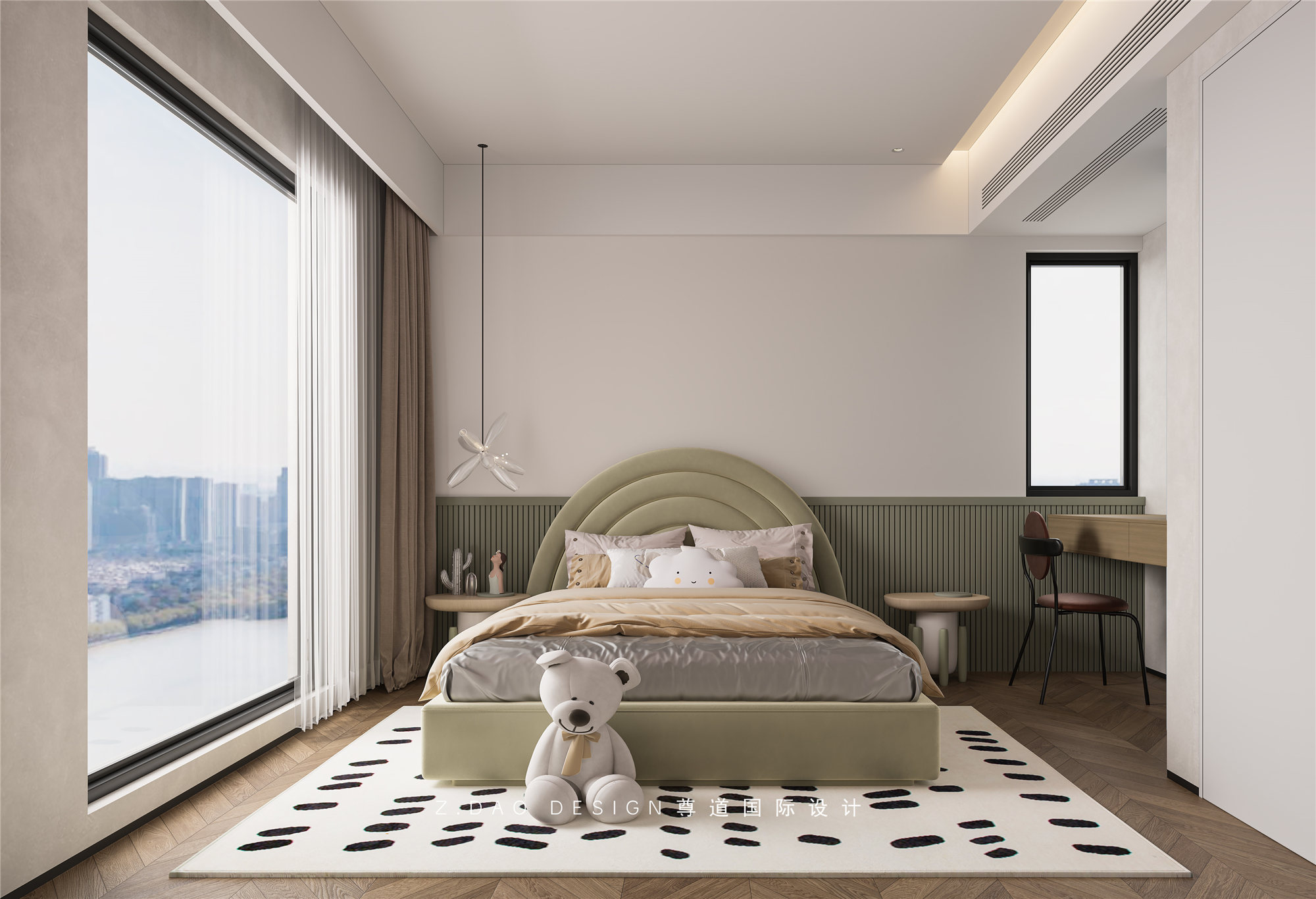 宝宝房是为了迎接刚刚出世的宝宝,床头采用中性色搭配格栅设计,墙面艺术涂料,家具造型上的选择,圆润的床头外观不仅仅可以柔滑视觉感觉减少边角感,也能避免以后小朋友不小心的磕伤碰伤。搭配童趣摆件,是整个空间变得灵动有趣。