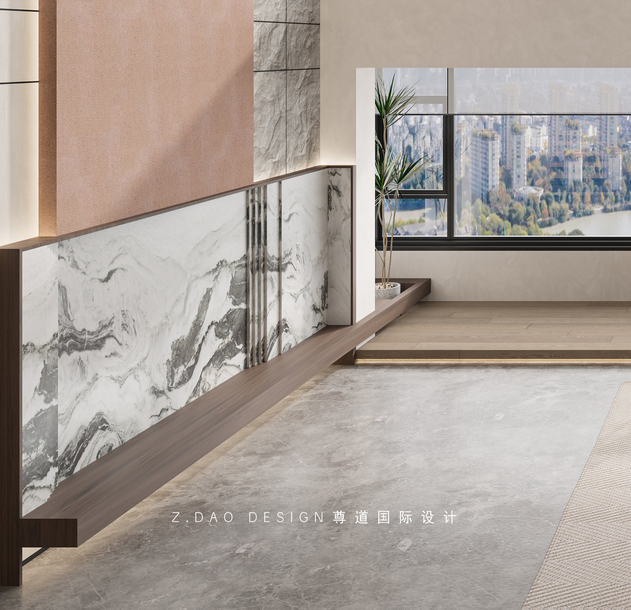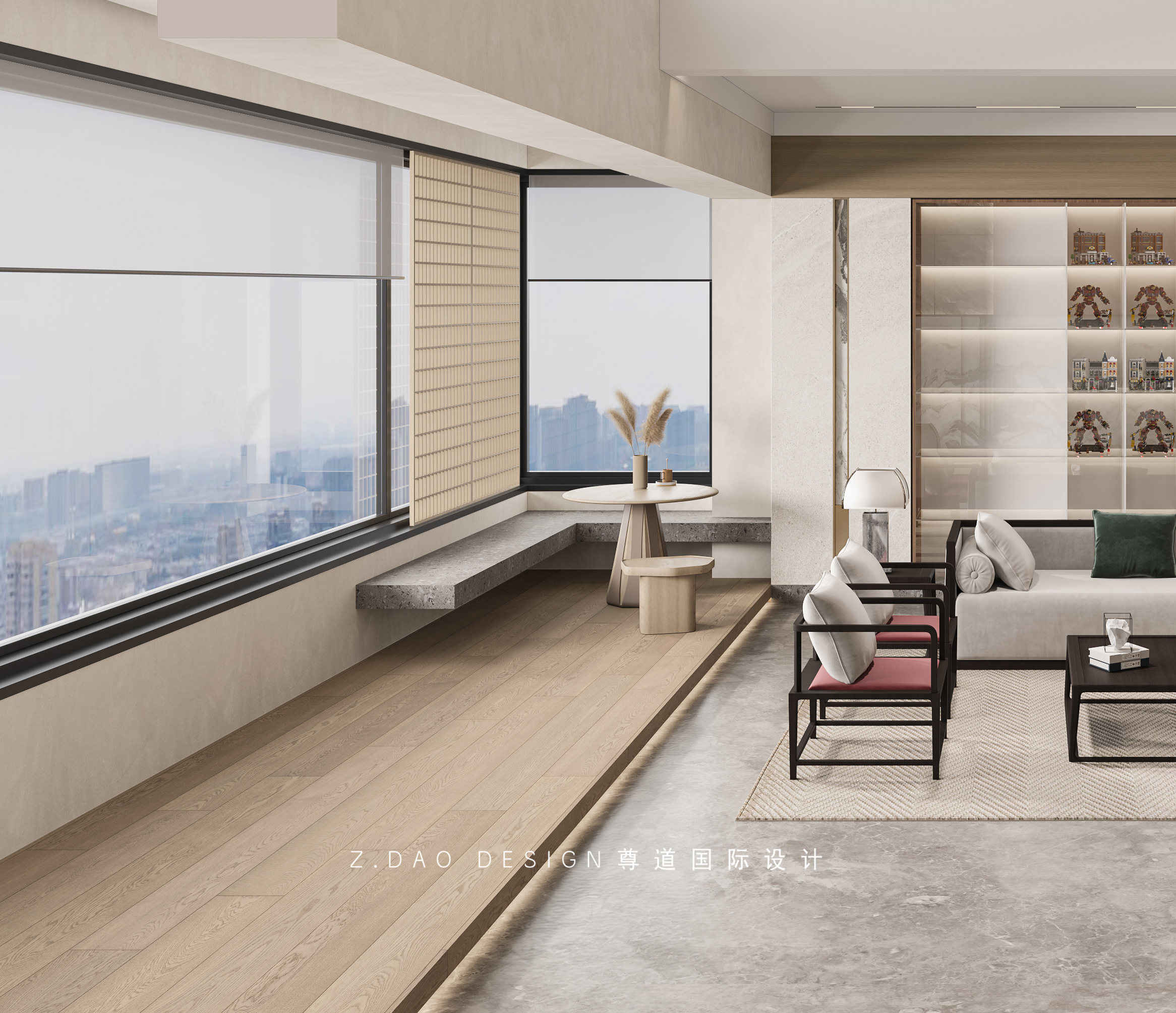 客厅的另一面,临窗设有石材窗台石,忙碌的生活可以放慢生活节奏,在窗台边小憩或者与亲朋喝茶赏景。