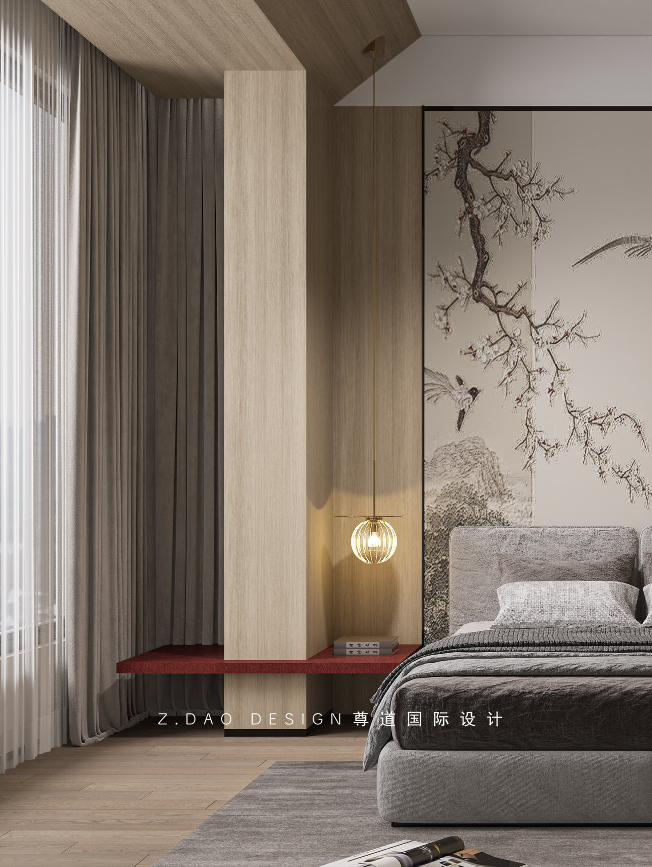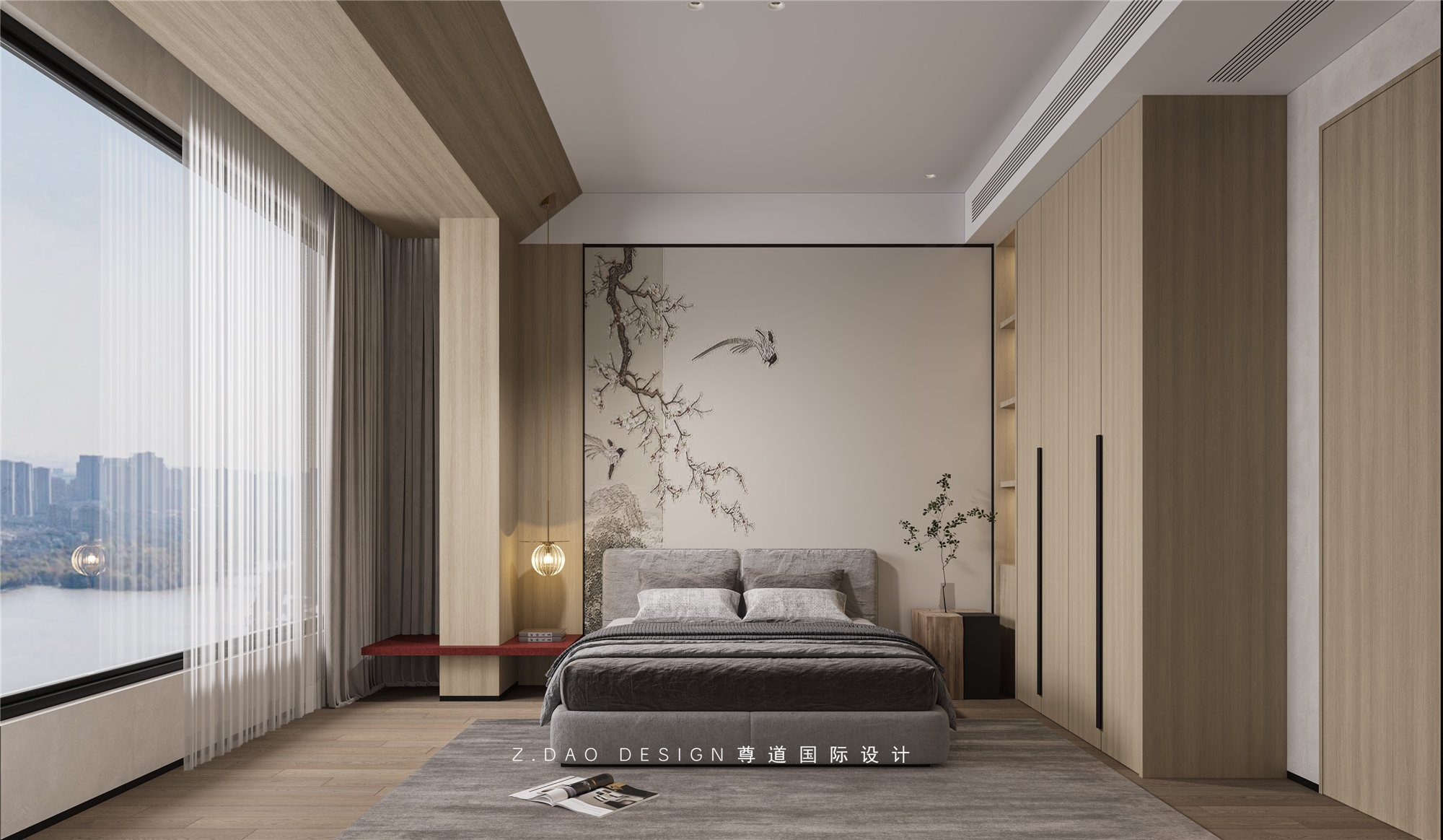 客房延续公共空间简洁大方的设计风格同时,满足睡眠休憩作用,背景墙是简单的中式元素墙布和布色墙板搭配,床头吊线灯搭配吊钟花,无论睡前阅读或者助眠,都是一进入就能充分调动情绪的地方。