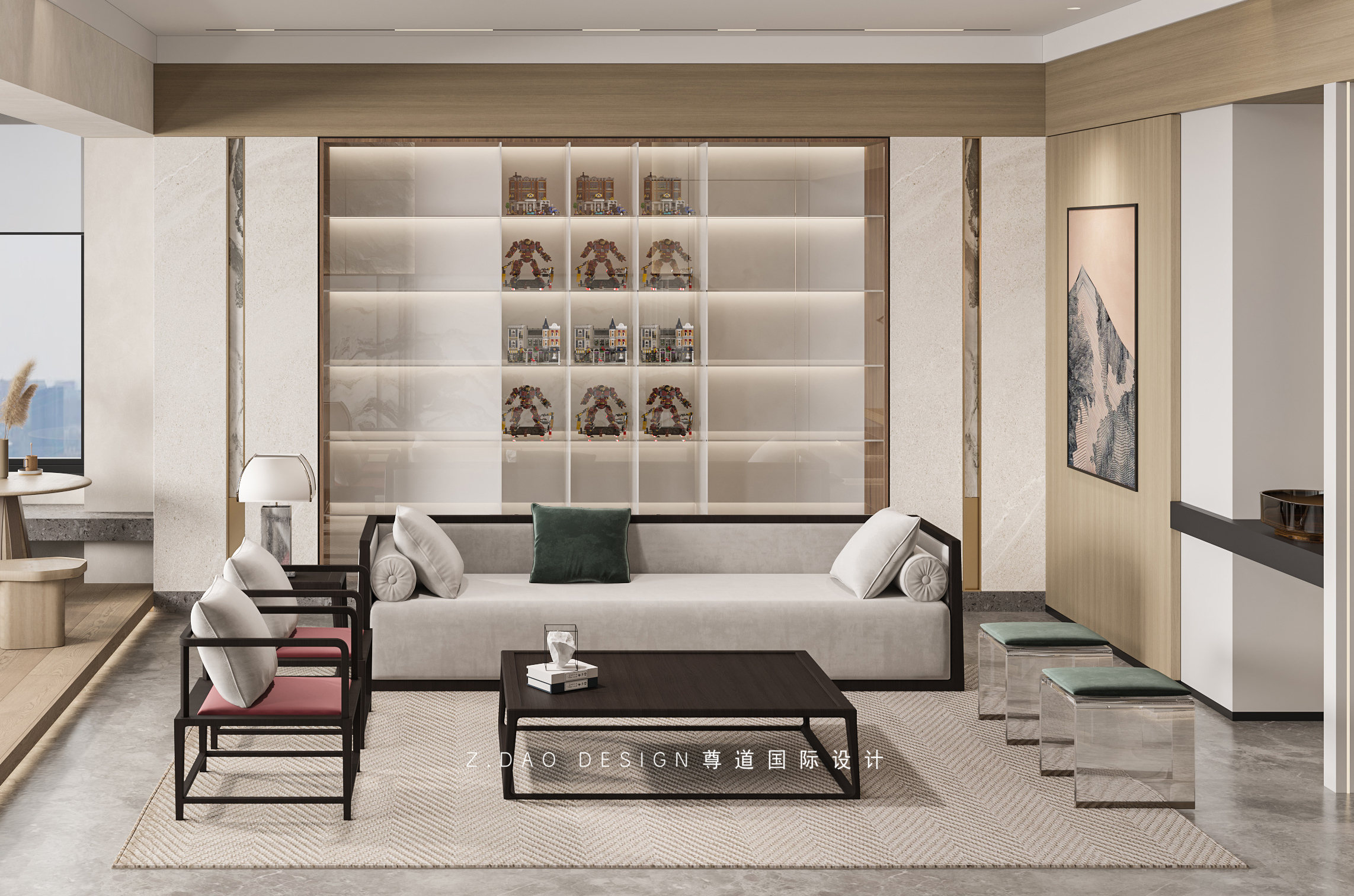 沙发背景书柜避免过多的木饰面,采用局部石材柜门结合玻璃开放格日常放置手办,书籍等。这不仅满足了主人日常的收纳展示需求,也创造了一个松与驰的生活方式。
