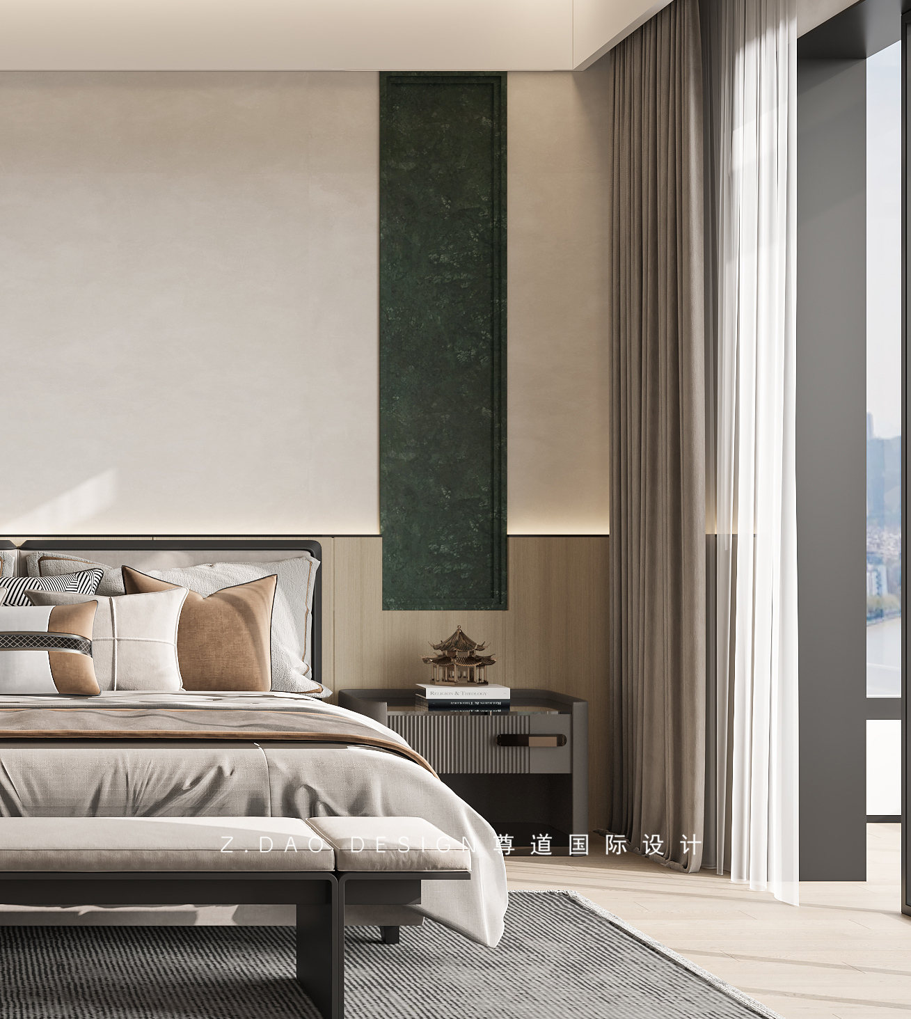 走进主卧,出入眼帘的是原木床头以及局部的绿色奢石点缀给人一副质朴、惬意、慵懒的文艺生活氛围感。