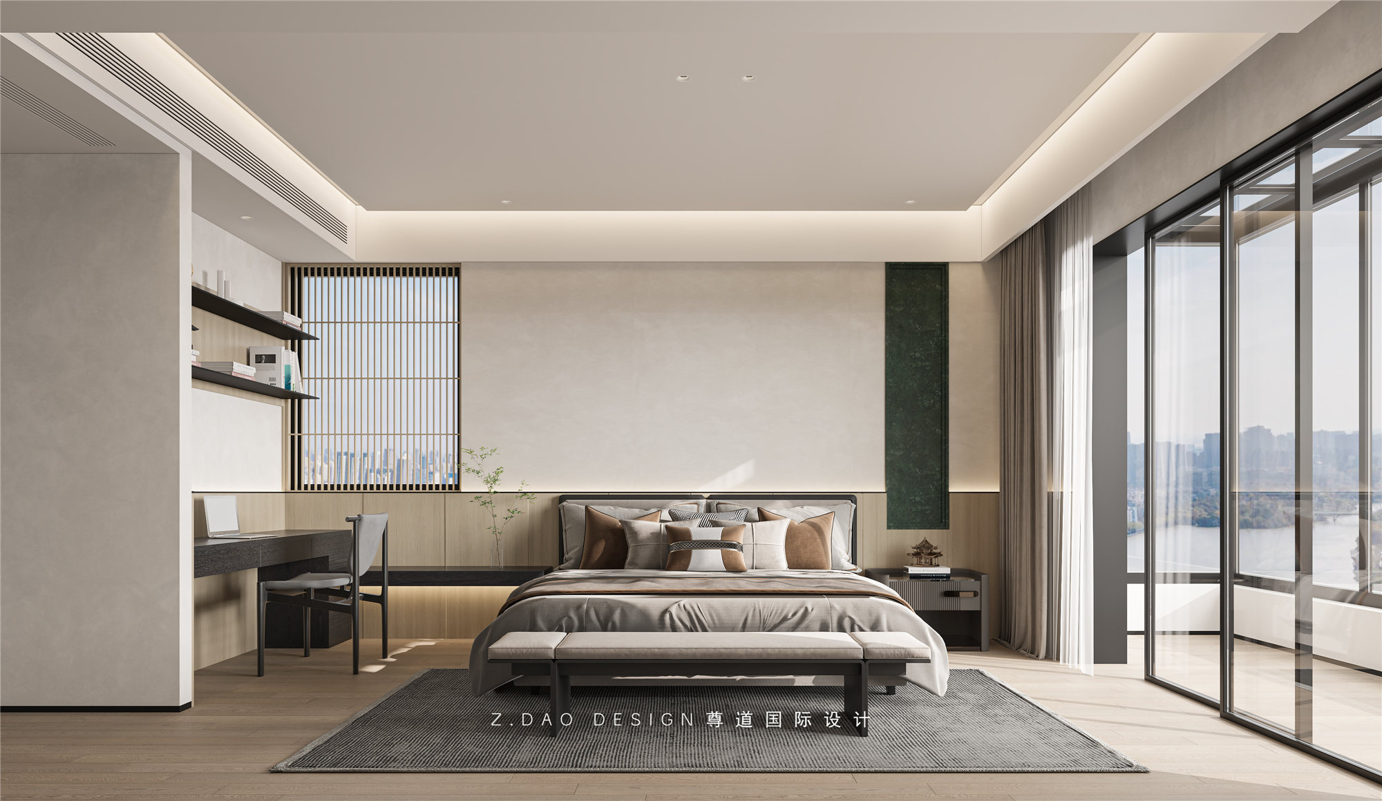 豪华落地窗给人极好的视觉享受。顶面斜面吊顶上增加一条线条灯为空间增添一抹亮色。
