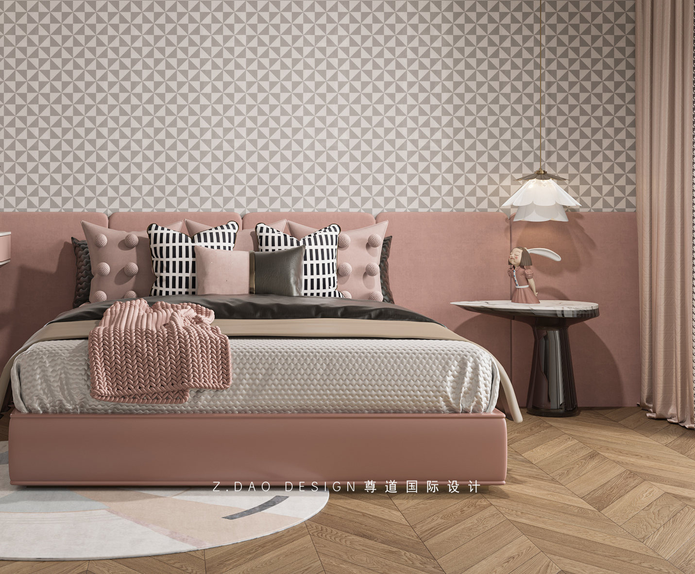 大女儿房屋内光与影的交替美,赋予了生活美妙感,是视觉和心灵上的双重享受,艺术墙布也是吸引力,让人陷入无尽的遐想。没有浓重的色彩,粉色的床头软包,搭配墙布勾勒出柔和宁静、舒缓雅致的空间美感,似乎具有抚慰人心的治愈美感,自然光的映衬下,让人倍感安心与温柔。