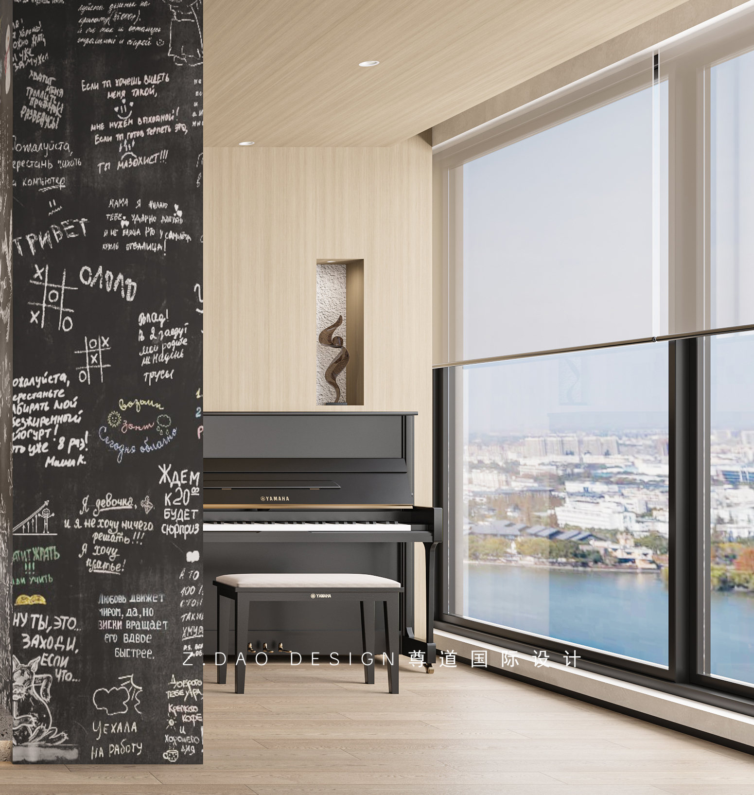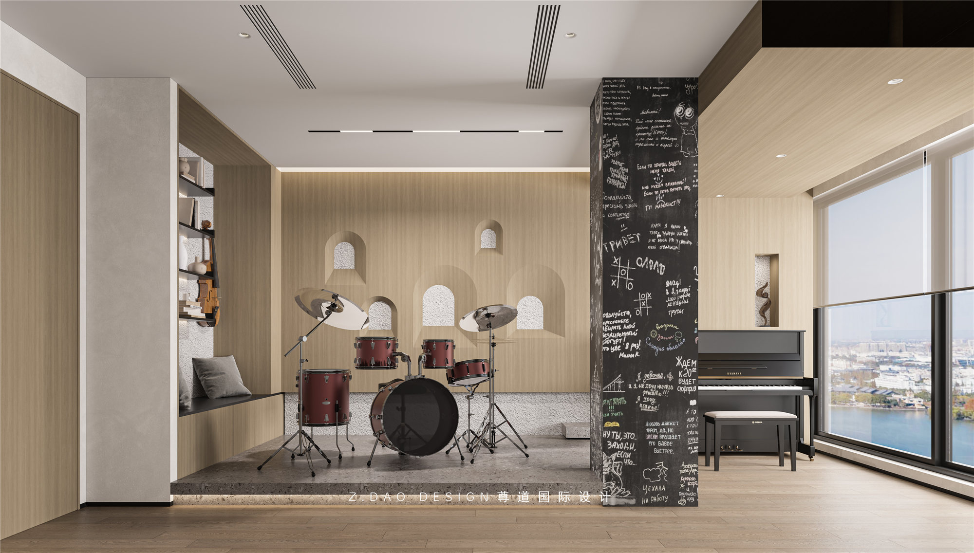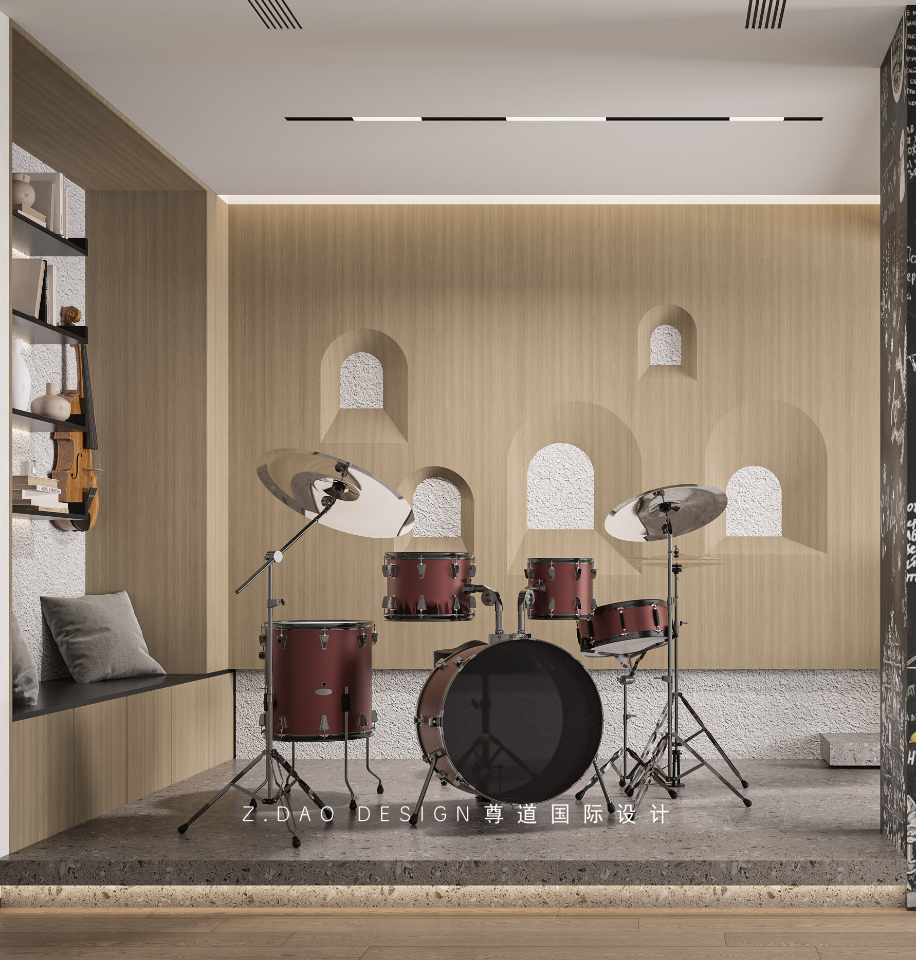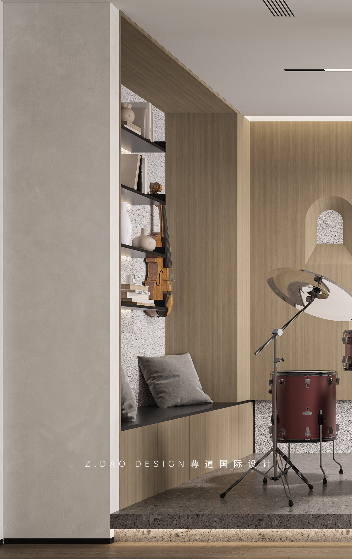 乐器房空间划分,地台区域给与架子鼓使用,在地台旁设置卡座,给与孩子们偶尔练习小提琴等小型乐器使用,卡座上方可以置放一些乐谱等,临窗设计钢琴区。