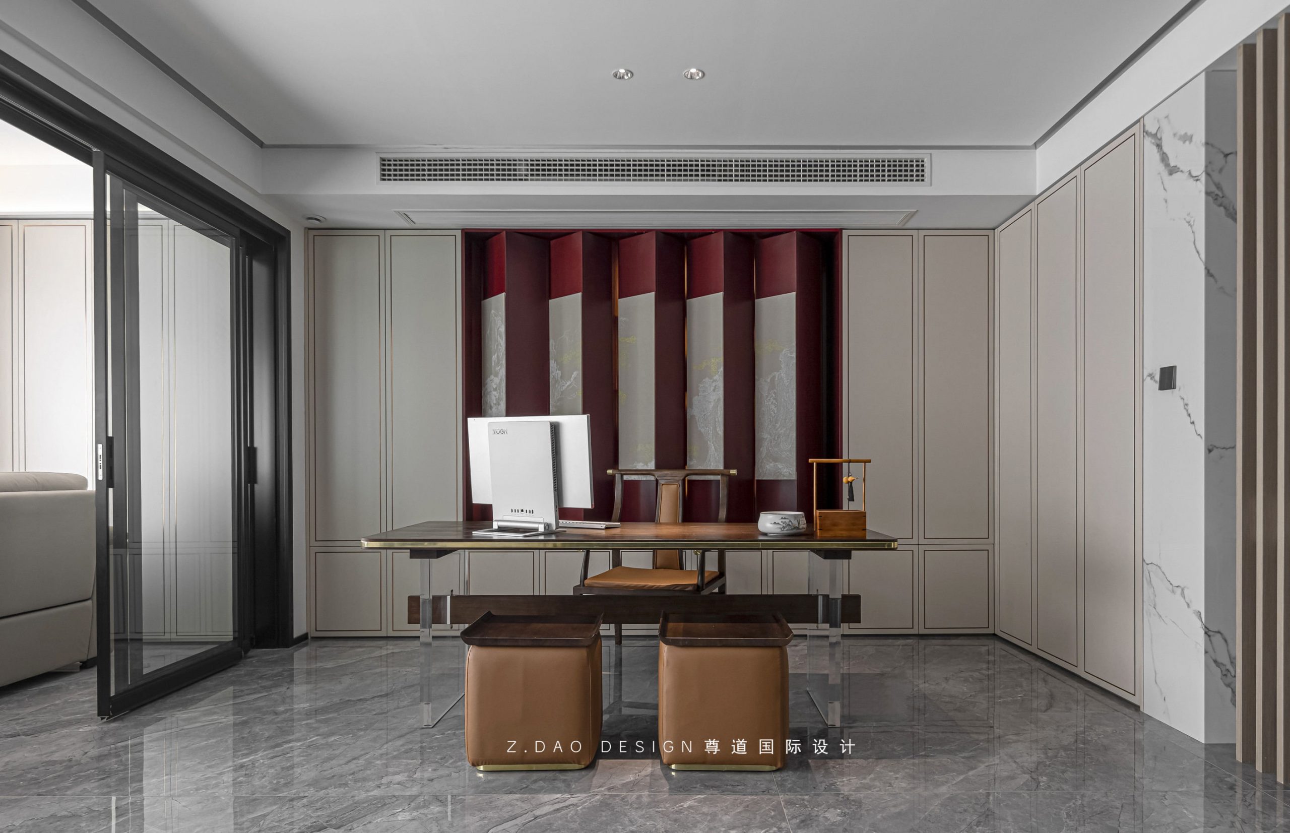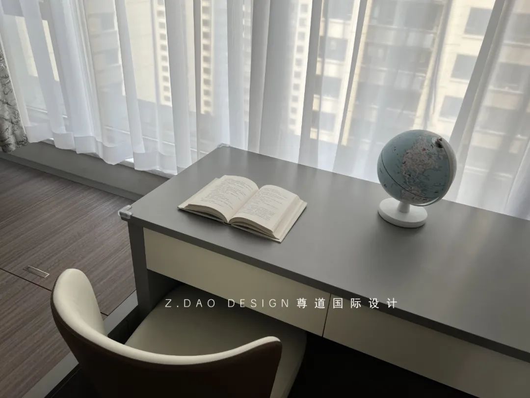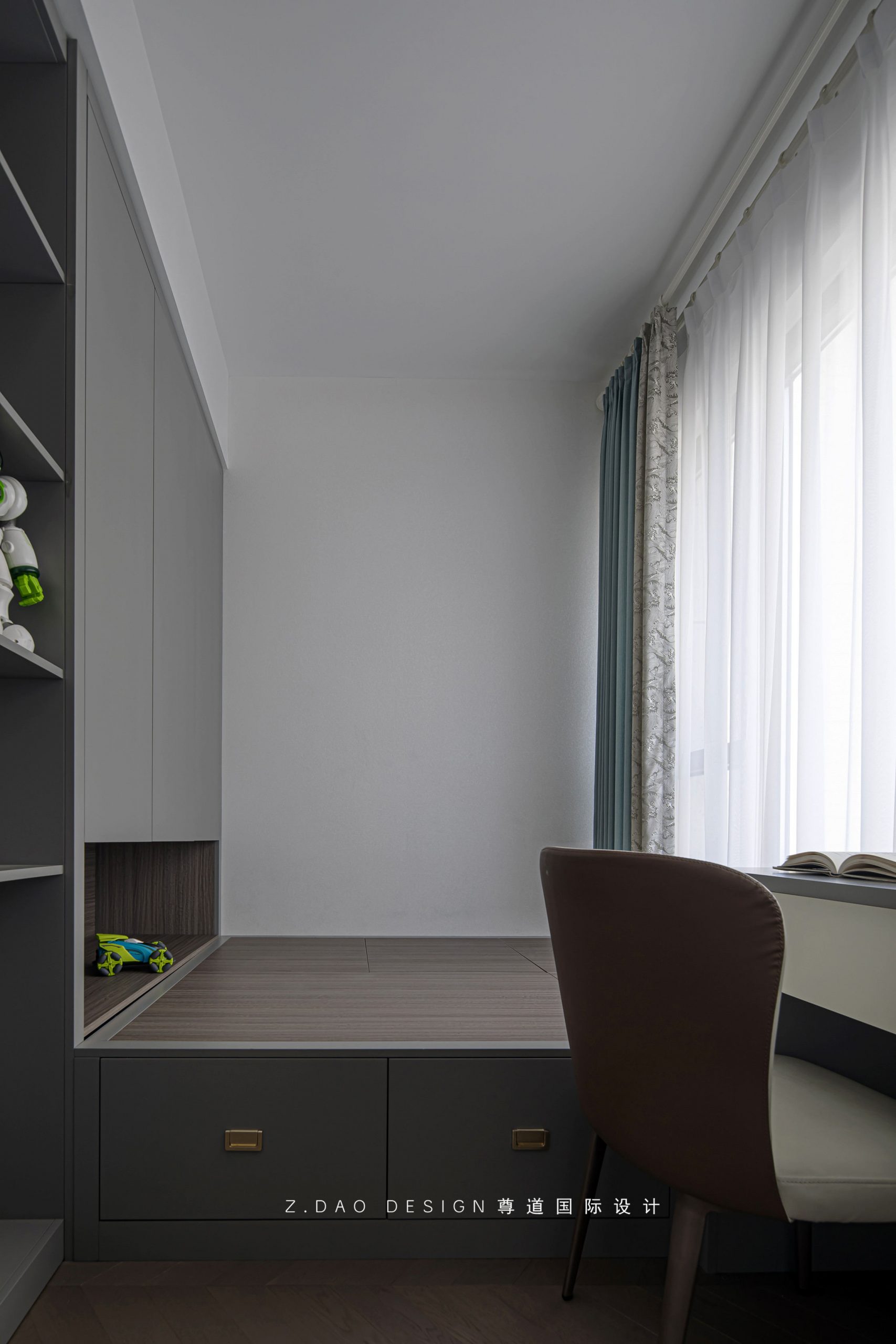 客卧采用榻榻米半屋布局,临窗位置设计书桌,柜体与书桌一体设计,大大提升了空间的利用率。