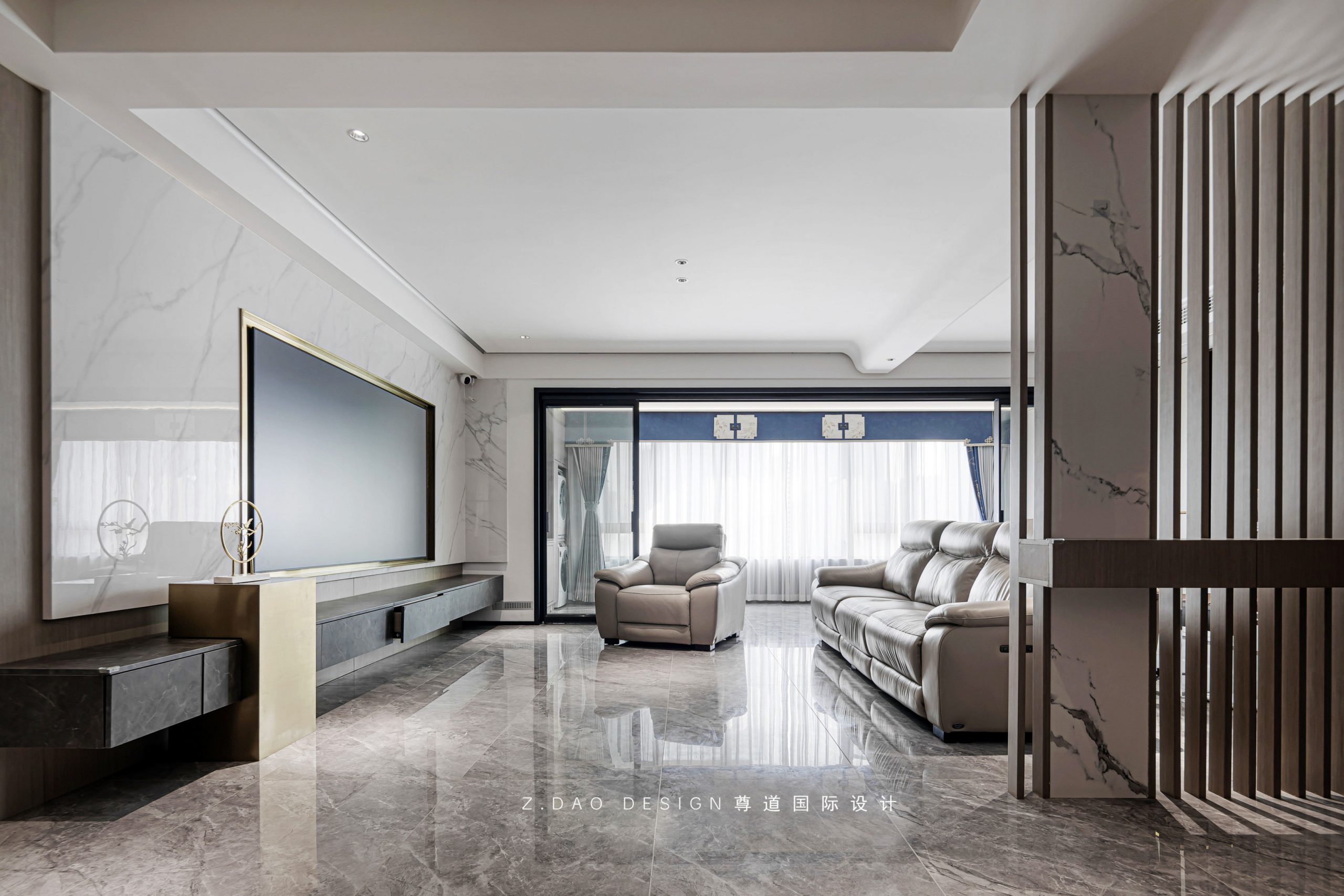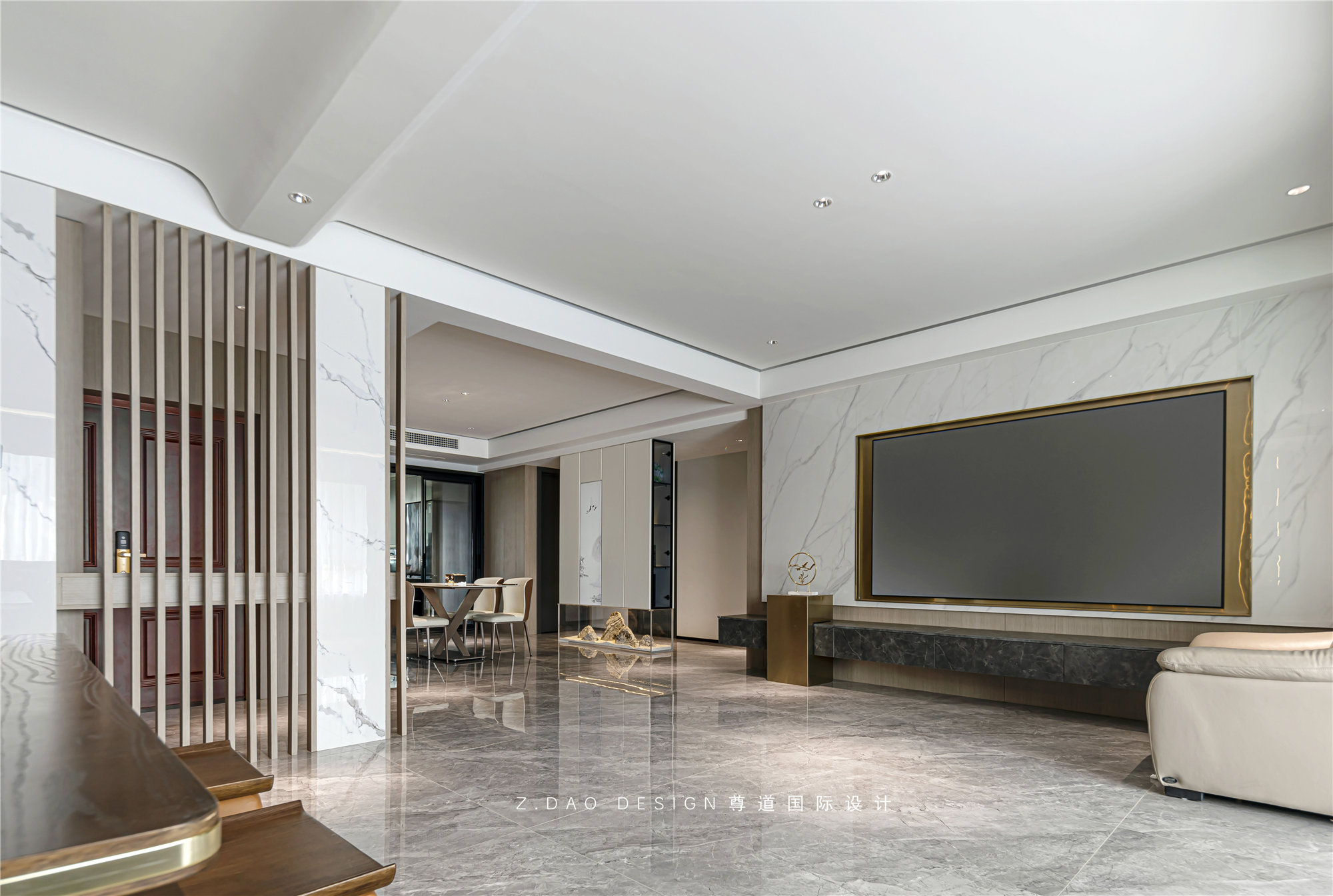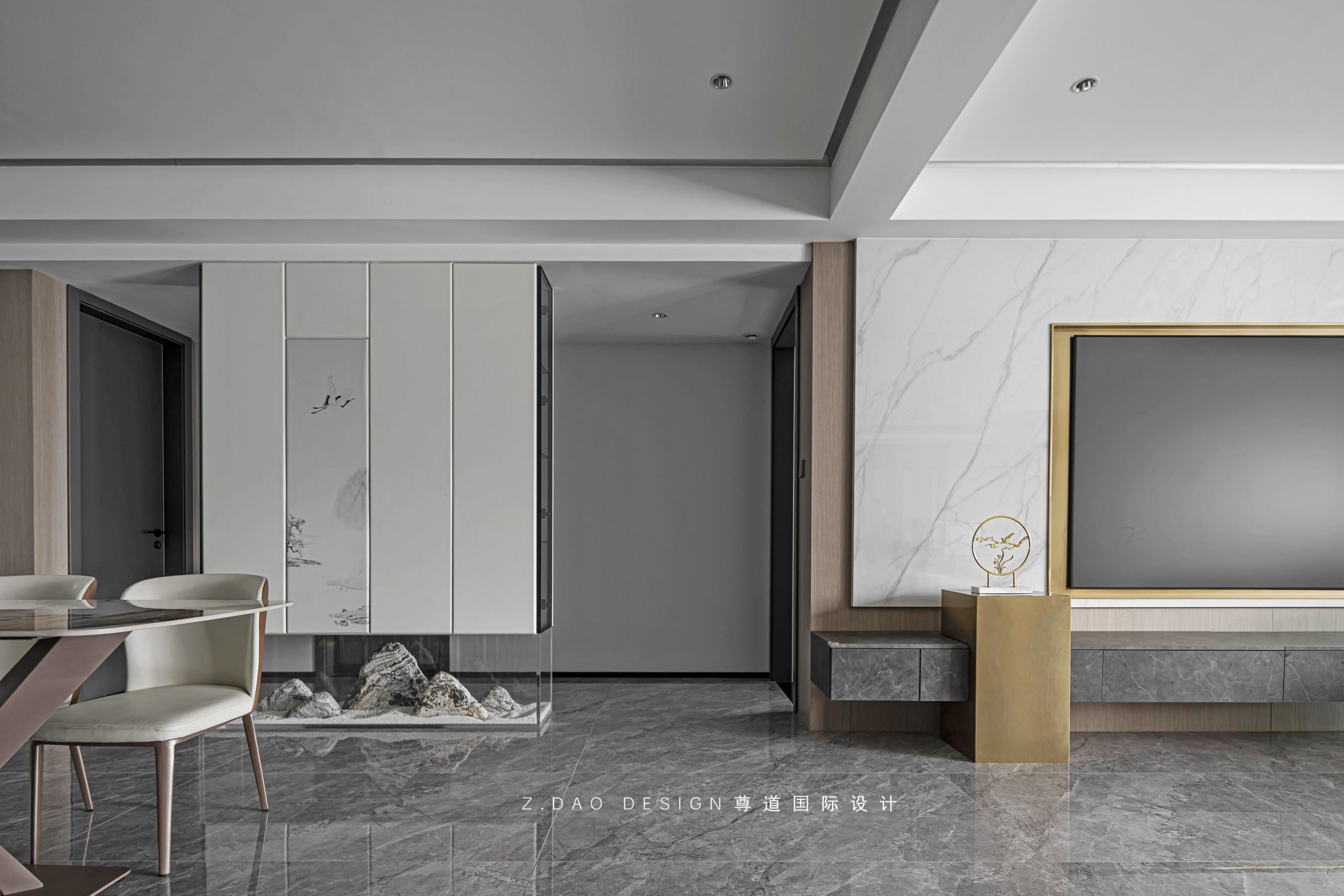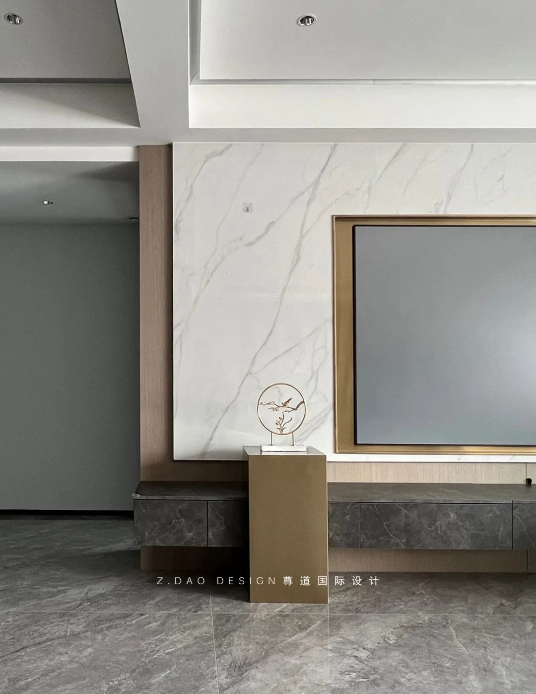 我们根据业主需要激光电视柜的需求设计了悬挑式的电视柜,不仅满足了激光电视能够收纳,也让客厅更具层次、时尚美观、设计感满满。