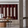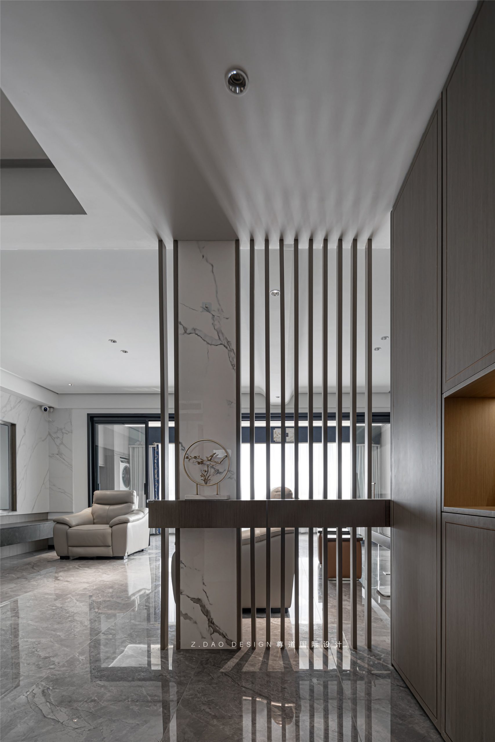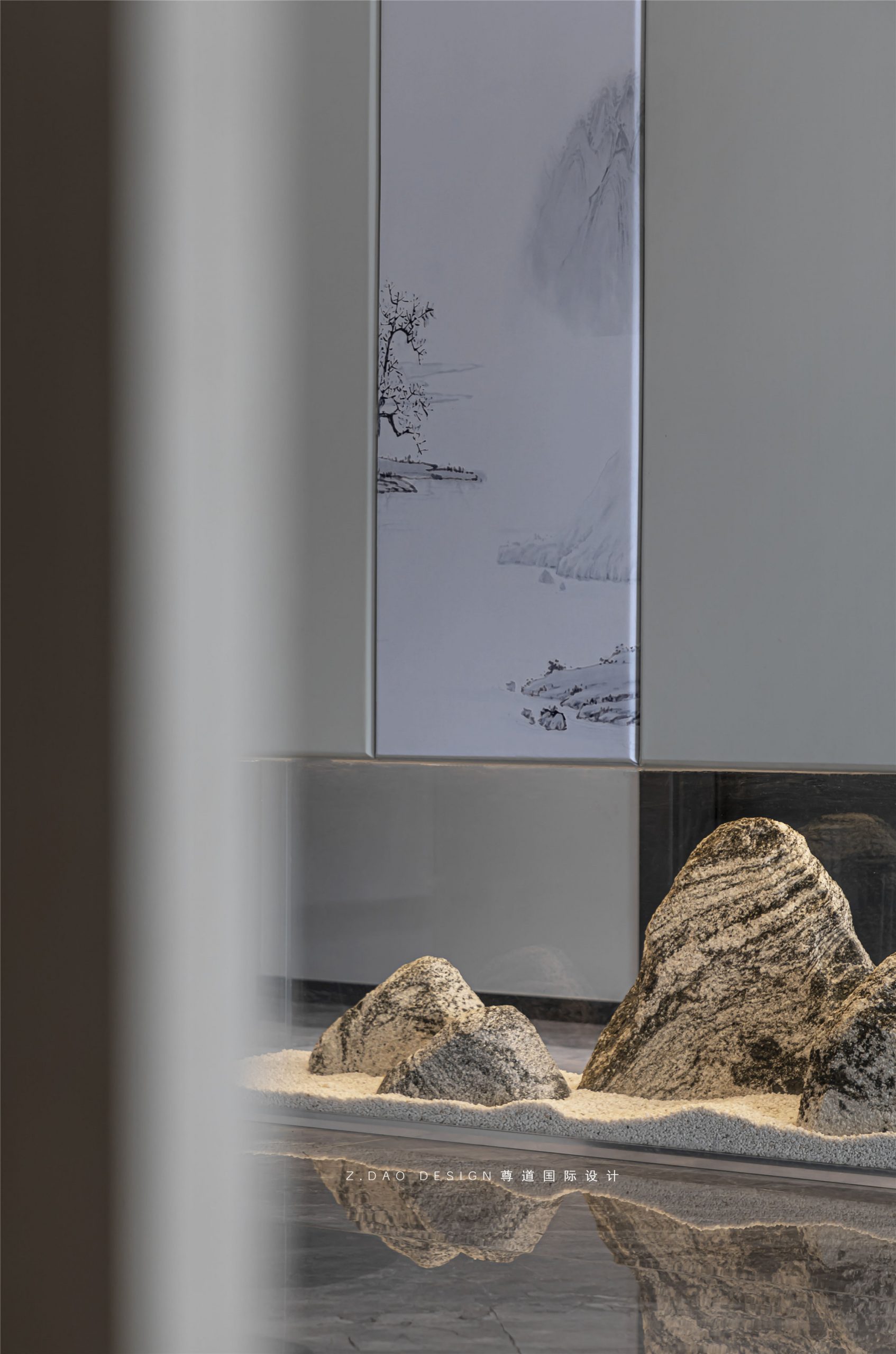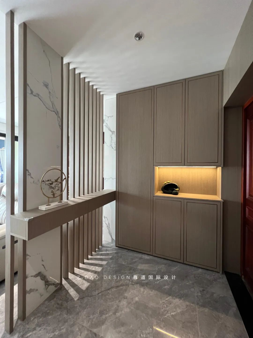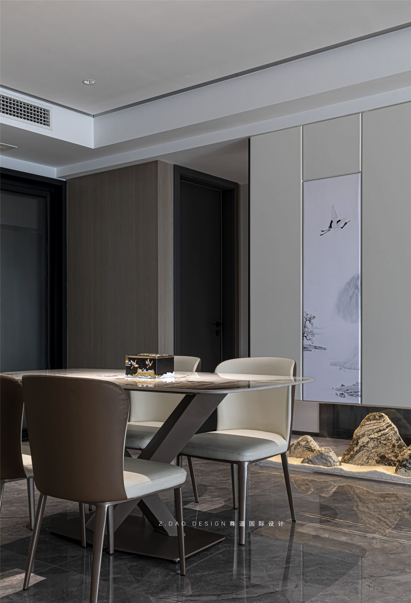 餐厅与次卫之间巧妙地运用悬浮式餐边柜进行隔断以及结合山水画以及让整个空间更加柔和的奶白色主题颜色会使整个用餐环境更舒服。同时在餐厅与卫生间及卧室等区域形成一个洄游动线。