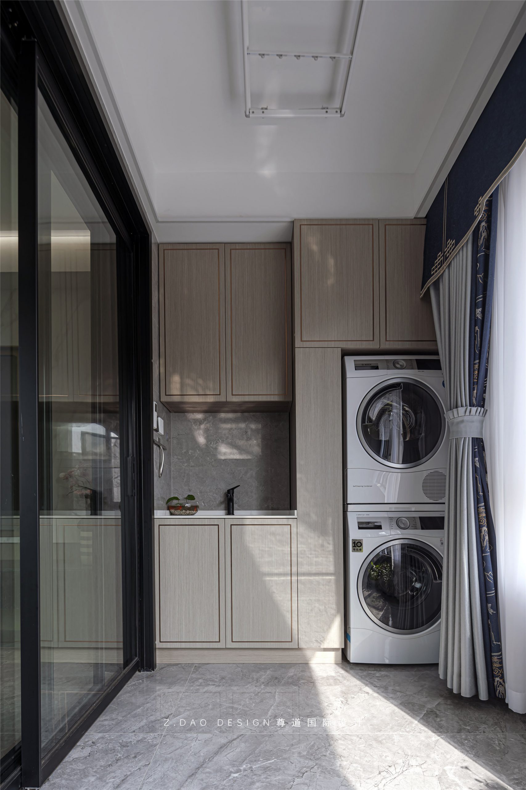 阳台与书房一侧打造柜体,增加收纳空间,带来视觉上的整体感;另一侧打造洗衣区,满足日常生活需求。