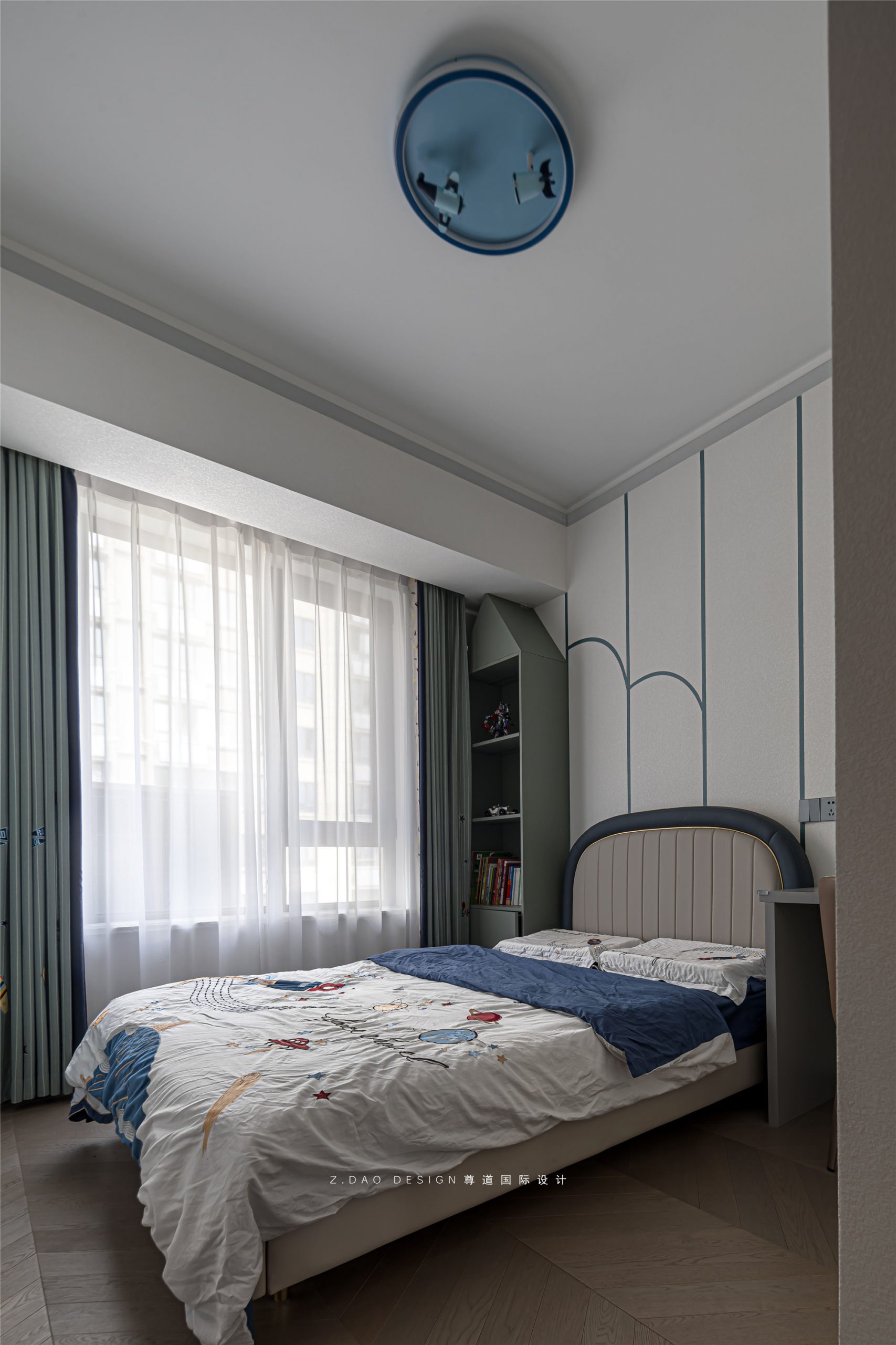 儿童房采用蓝绿跳色,柜体尖顶造型丰富了整个空间的趣味性。