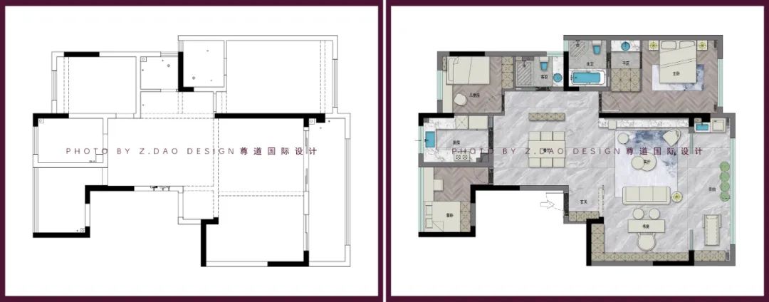 主卧空间在保证原始空间不变的情况下,合理区分出主卫的干湿区,干区设计背对背式衣帽间极大的增加了收纳储物的空间。