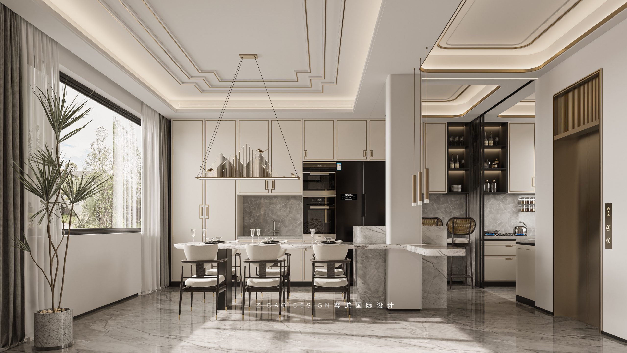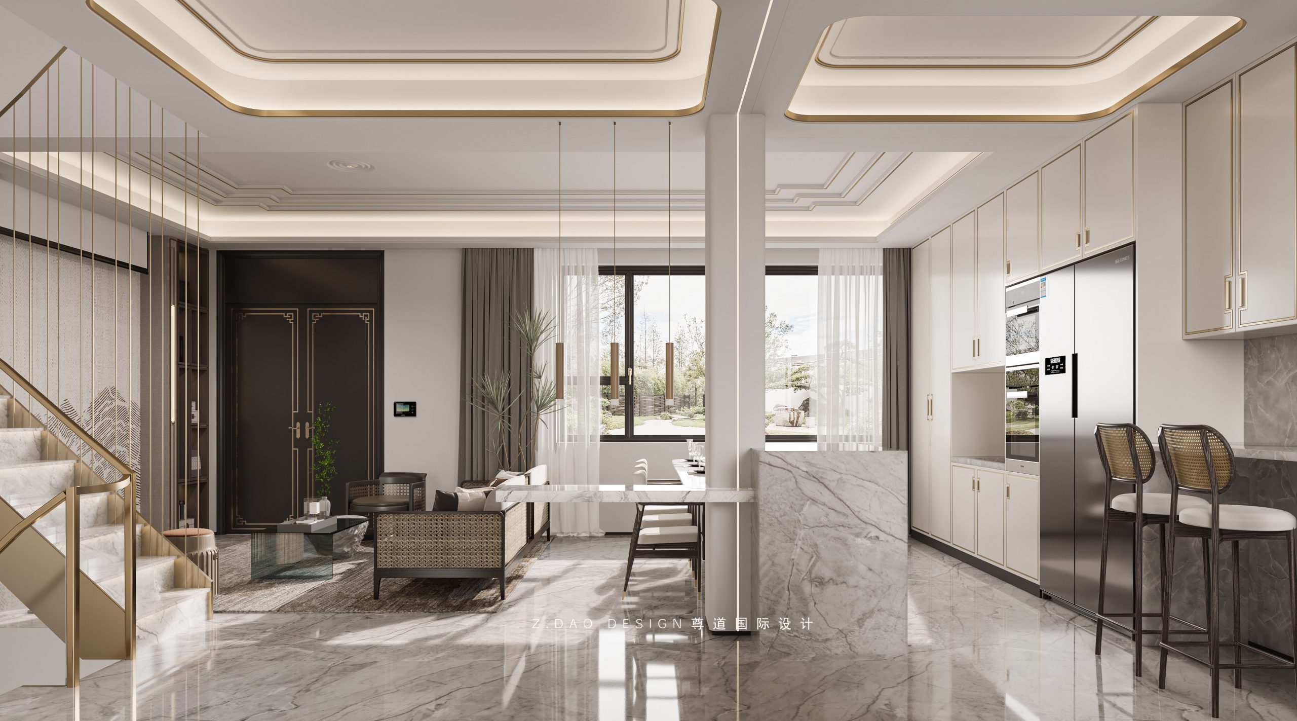 顶面采用圆弧吊顶,餐厨空间各有一处大理石元素,点缀着这一份稳重的格调,跳脱又活泼。采用大量金色型材装饰,既彰显中式风格的高贵气质,又将空间关系相互串联起来,仿佛是一个整体。