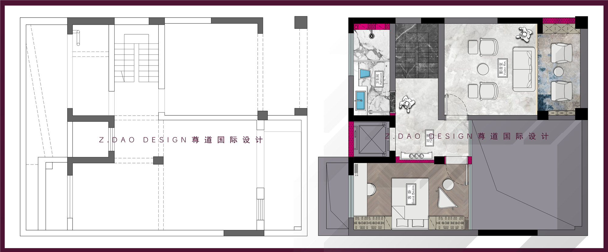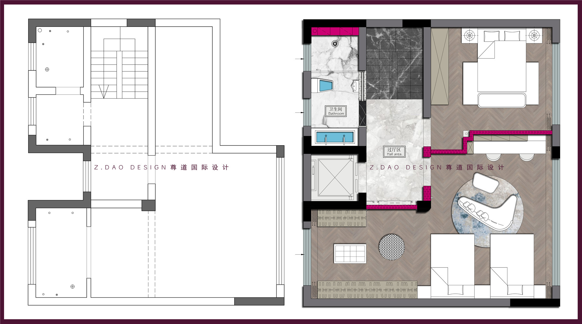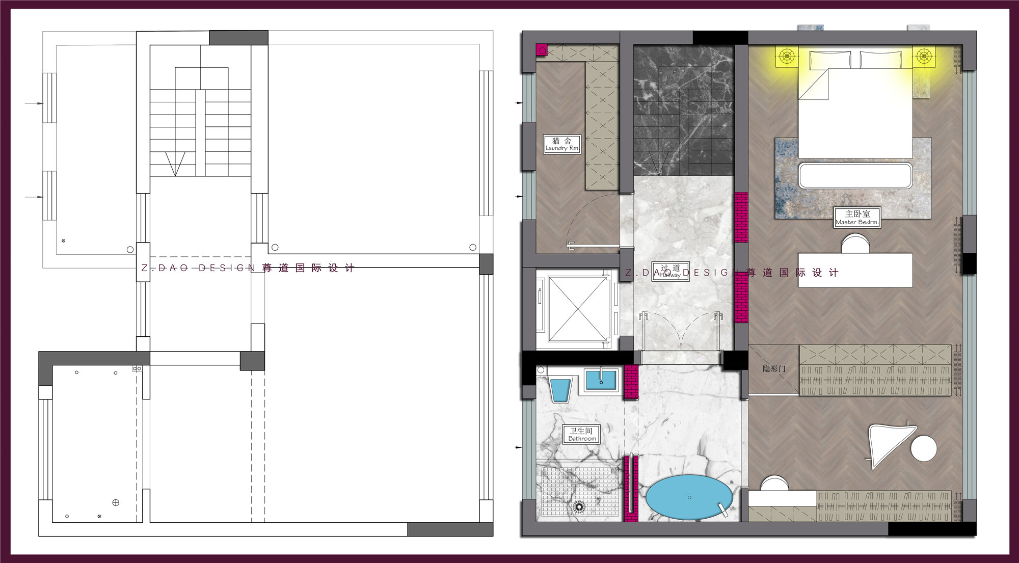 1、拆除南侧房间中间的墙体,打通整层做成一个超大的主卧室套房;
