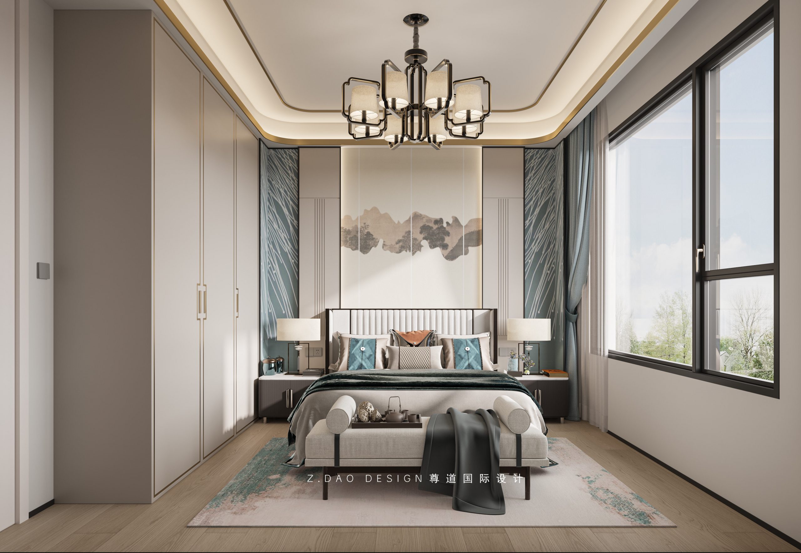 二层父母房背景墙面采用硬包定制造型,背景墙上的中式山林画与黑色型材用暖光灯带烘托;弧形的吊顶和方正的房间形成中式所谓的天圆地方,灯带和主灯配合照亮空间,沉稳的空间油然而生。