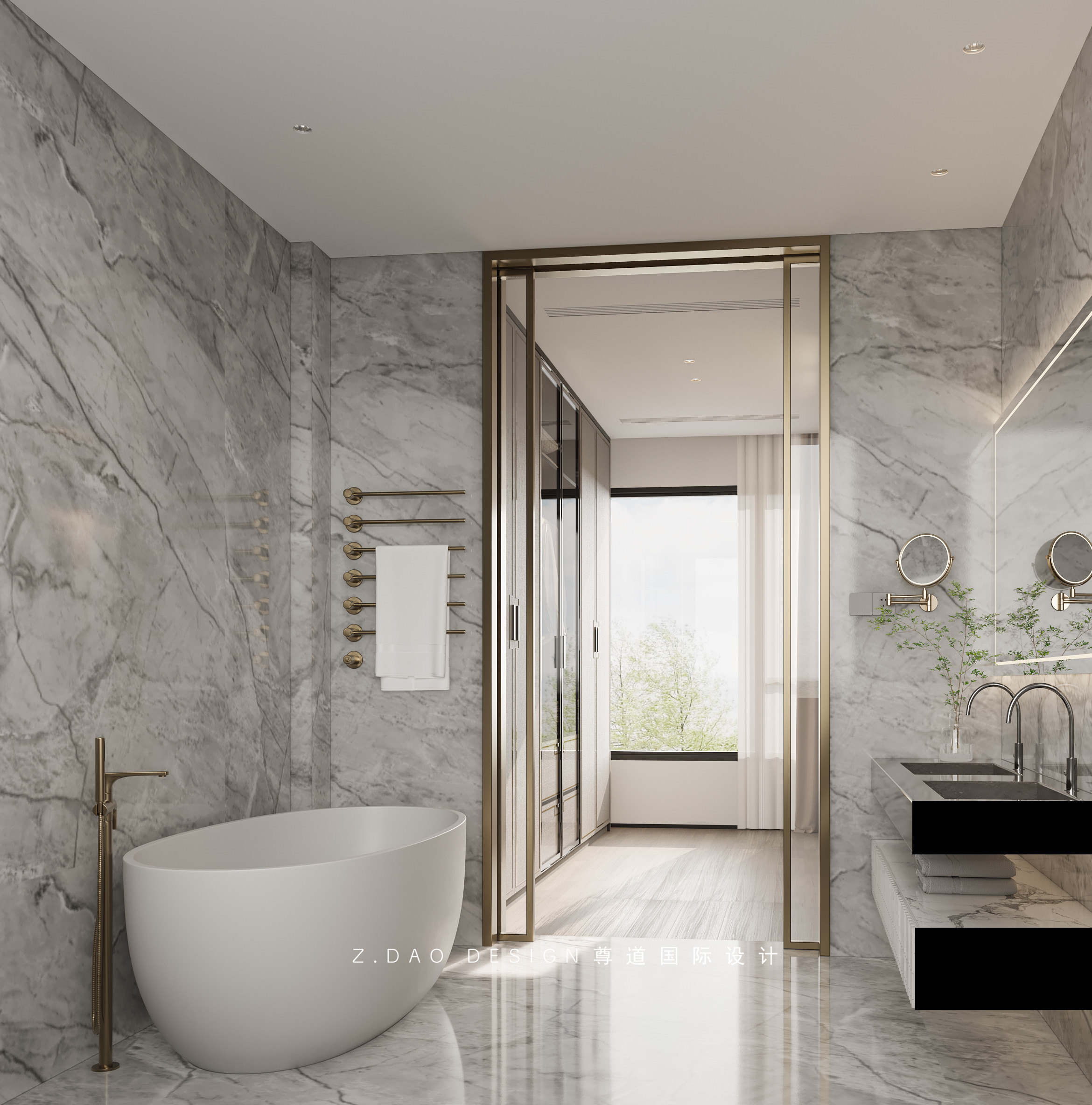 五分离式主卫空间,做到美观的同时具备使用功能,圆形浴缸正对入户房门,进入房间便是满满的仪式感。