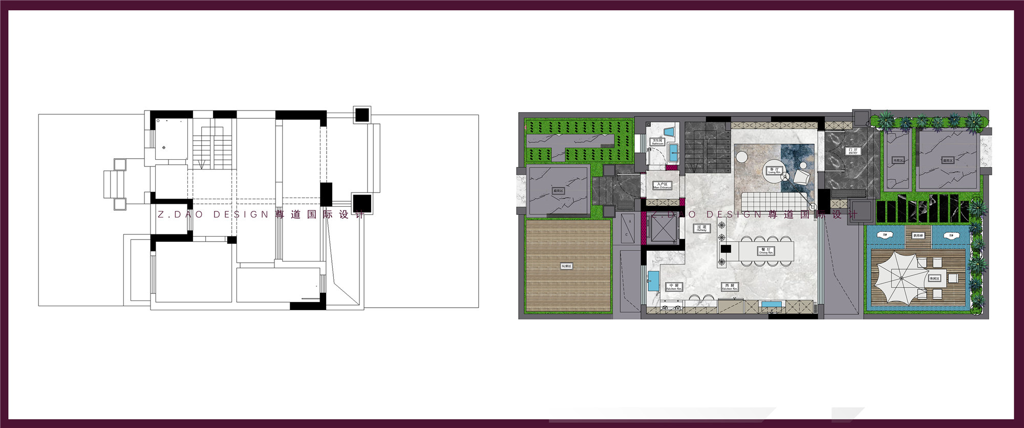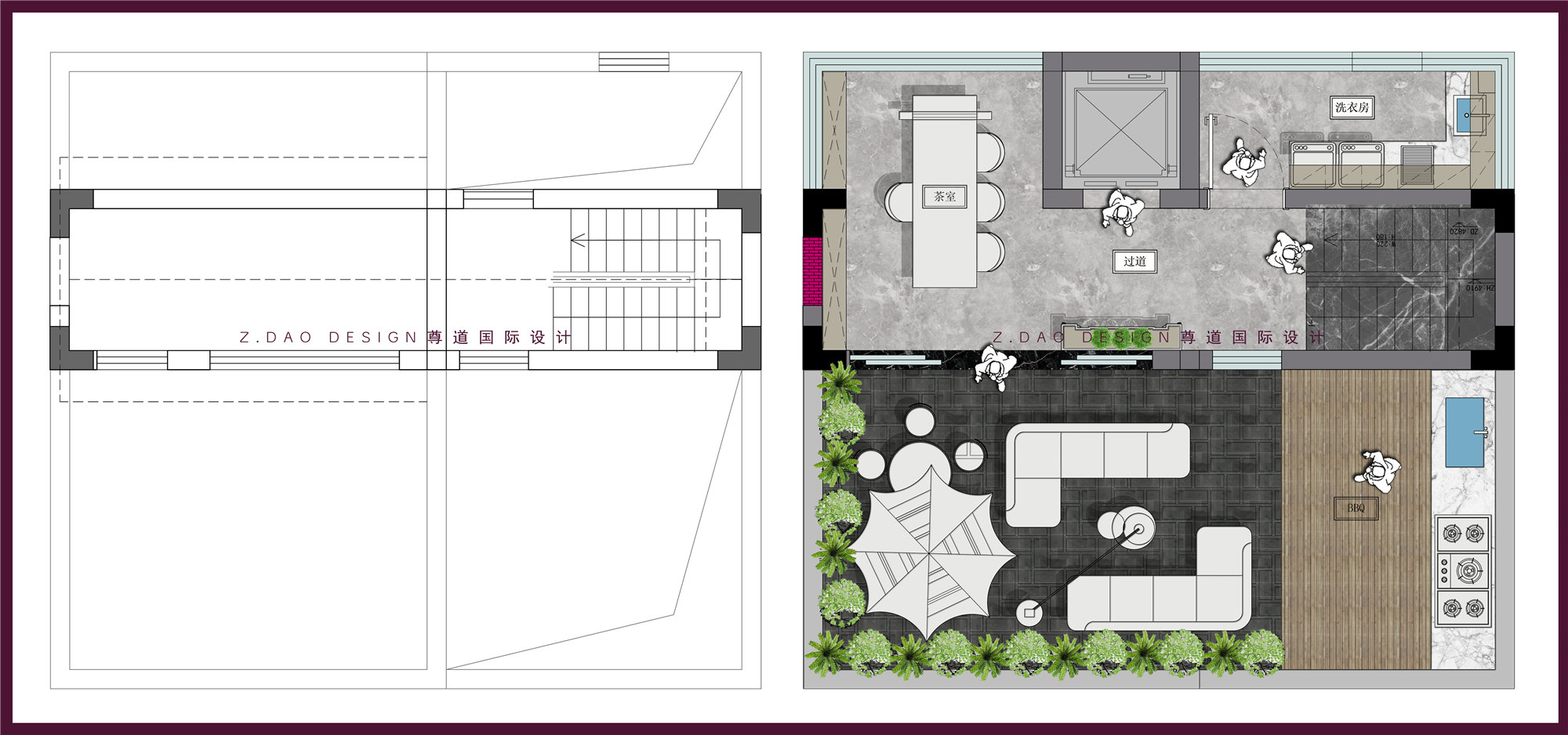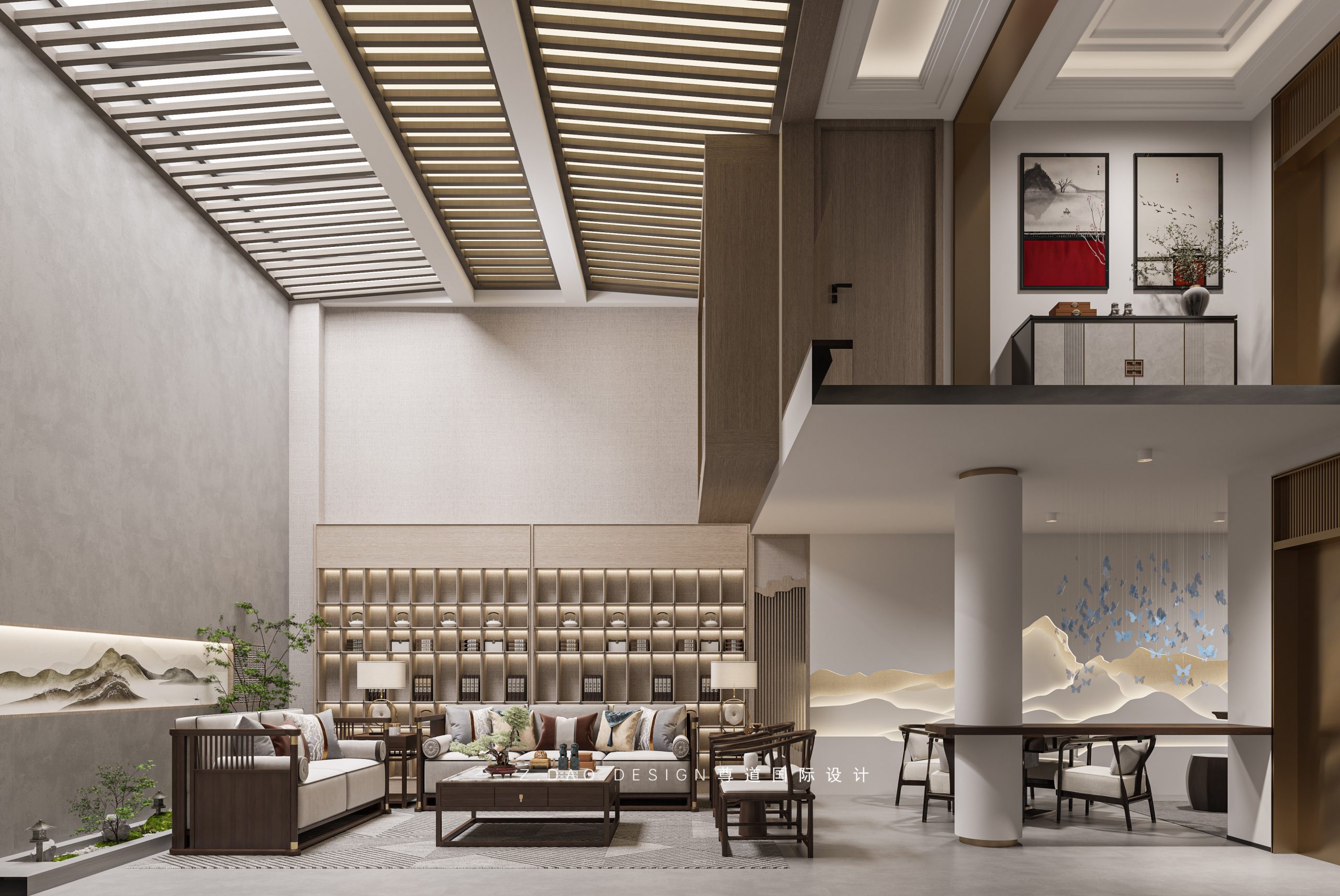 茶桌一侧做造型墙,露台的到顶联动拉门和茶室另一侧的落地全景窗使室内外的空间通透自然,三面开阔的采光和视野使窗外景色尽收眼底。