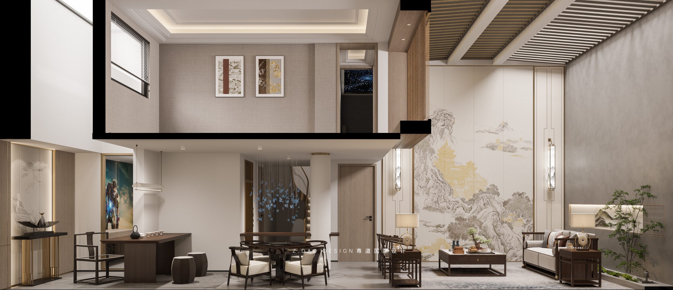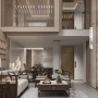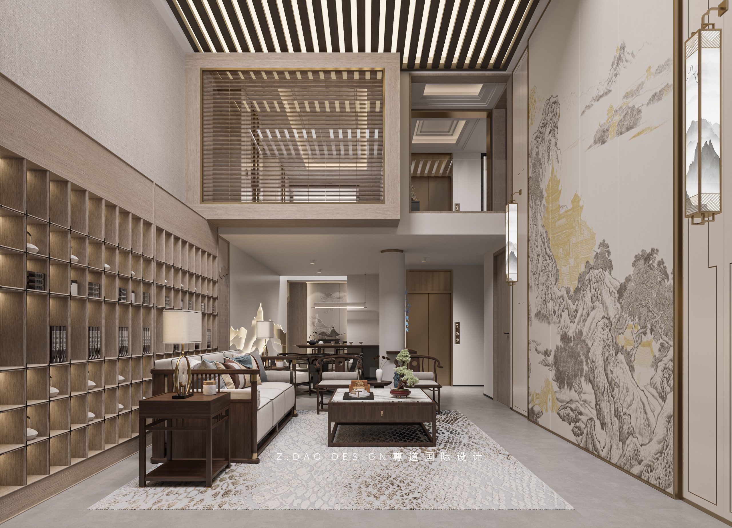 由车库进来是会客厅,满墙开放柜体充斥中式书香气息。正对会客厅的背景墙,贯穿负二层、负一层两层空间,具有穿插作用;整面巨大背景墙采用硬包墙板定制,对称且中式元素,彰显恢弘大气。