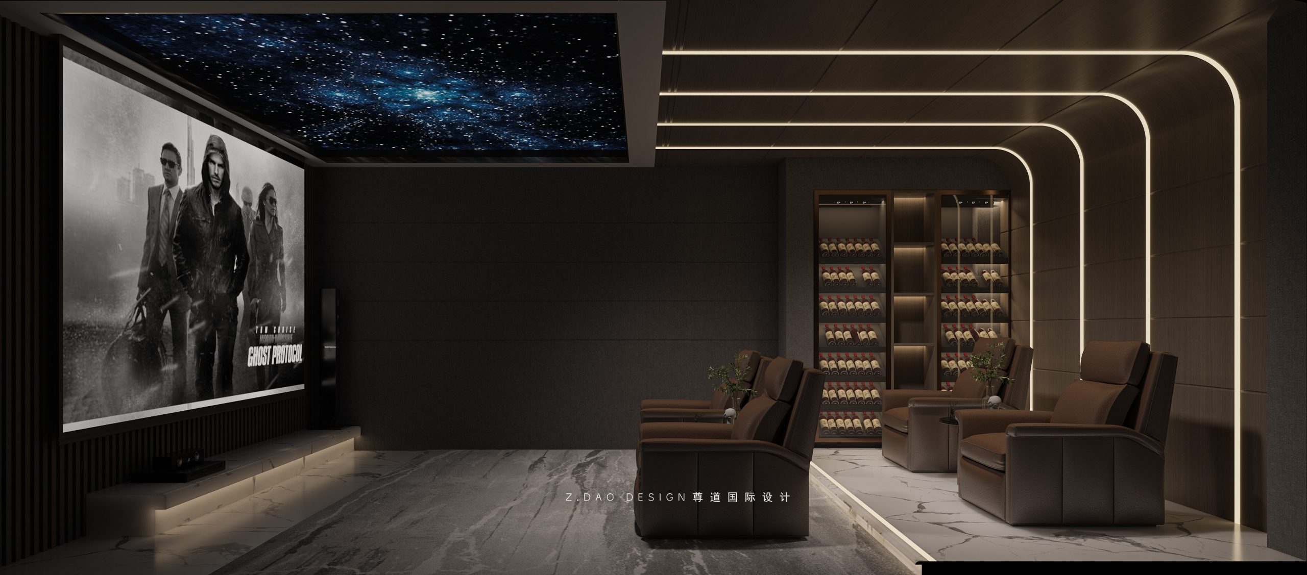 顶面做星空吊给空间带来神秘、深邃,地面使用花纹丰富大理石地砖,后座区域做地面抬高,配合灯光使昏暗的影音室不显单调。后座观影区的里侧做了两扇酒柜,衬托了空间的同时也方便了观影时小酌两杯的情趣,私人订制沉浸式观影体验。