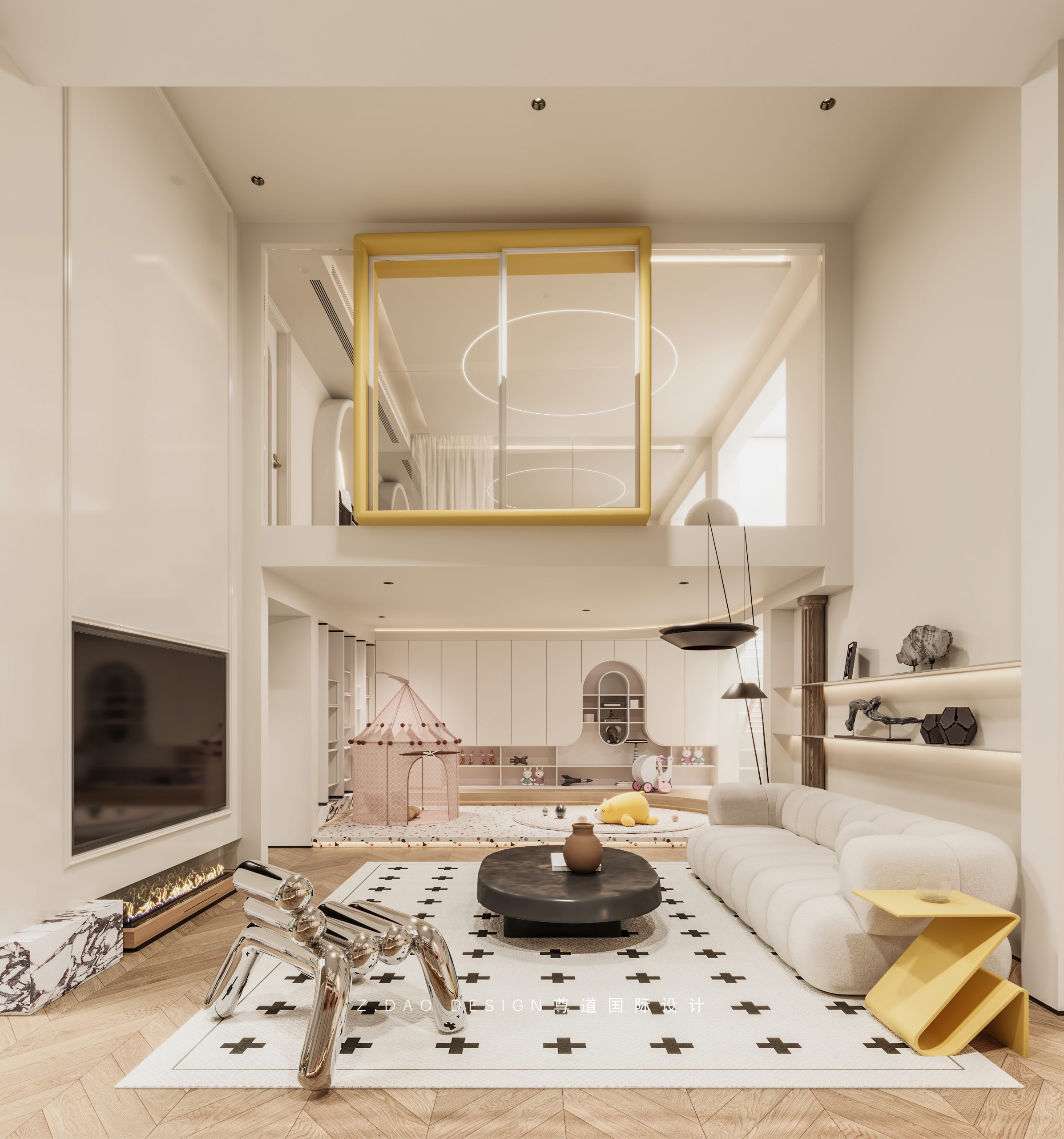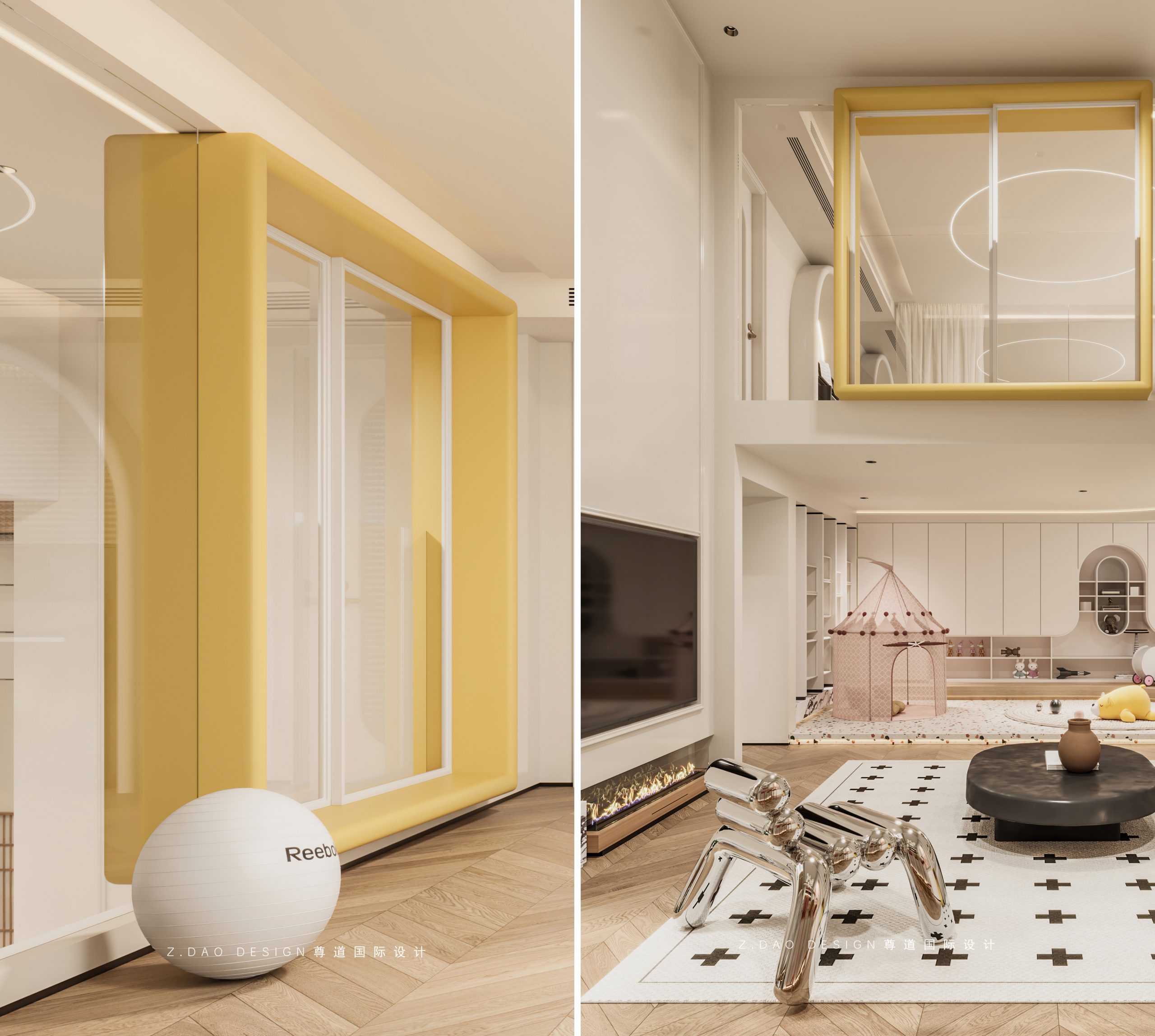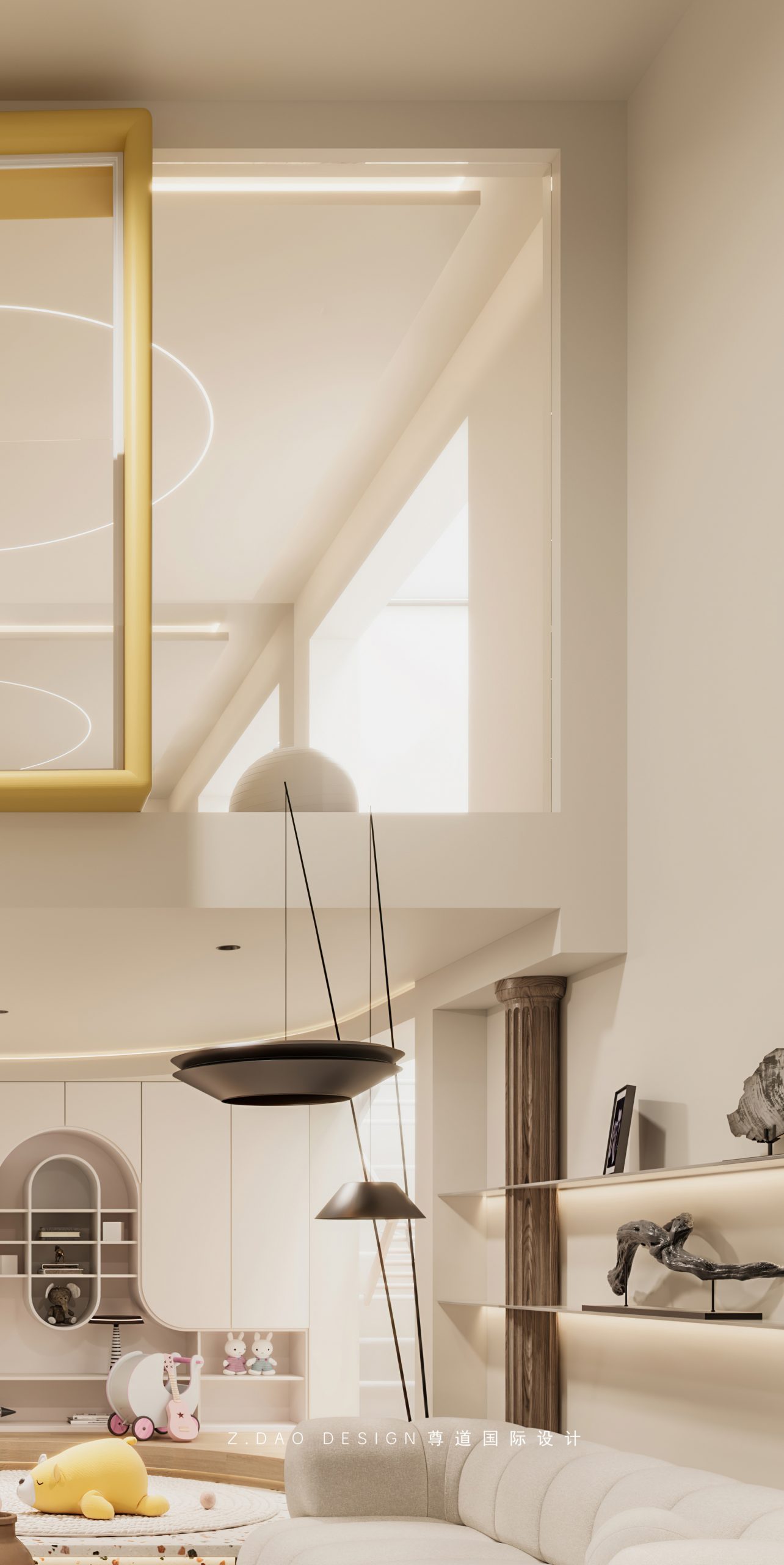 进门右侧造型窗框使用暖黄色给空间赋予灵动性,增加楼上楼下互动性。