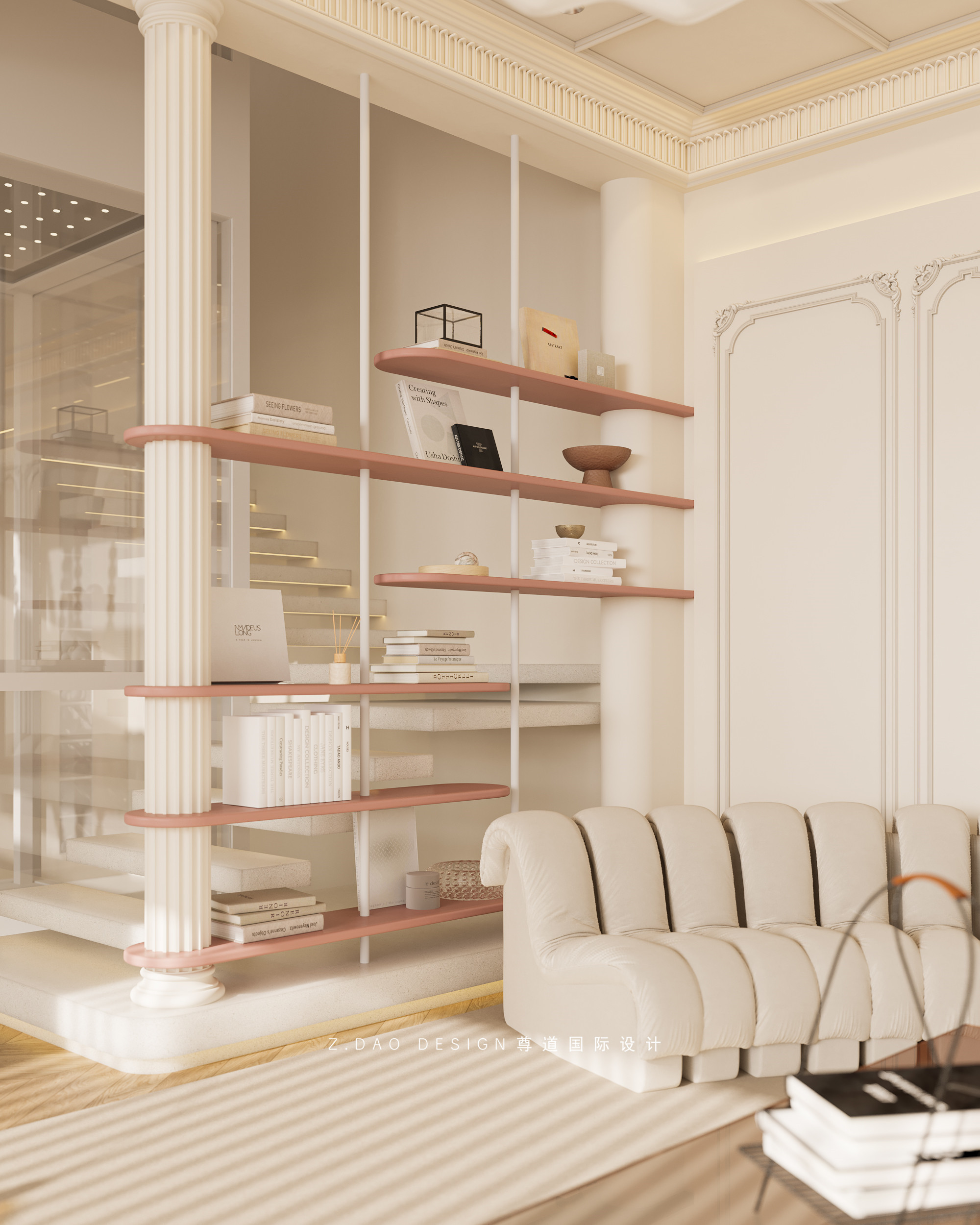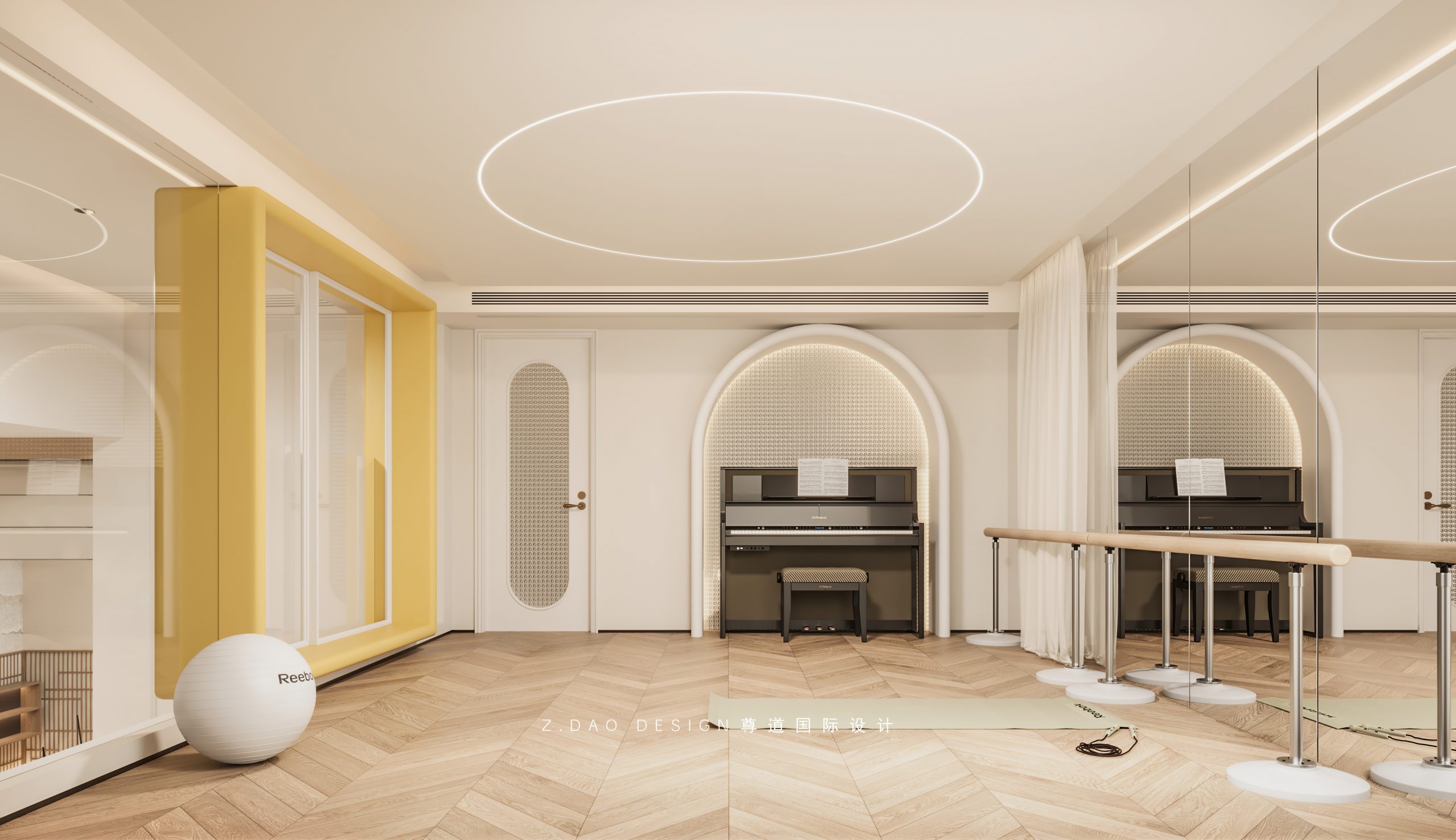 舞蹈房整体设计采用大面积的暖色系,配合墙面拱形造型,让整个空间有层次的同时富有立体感。