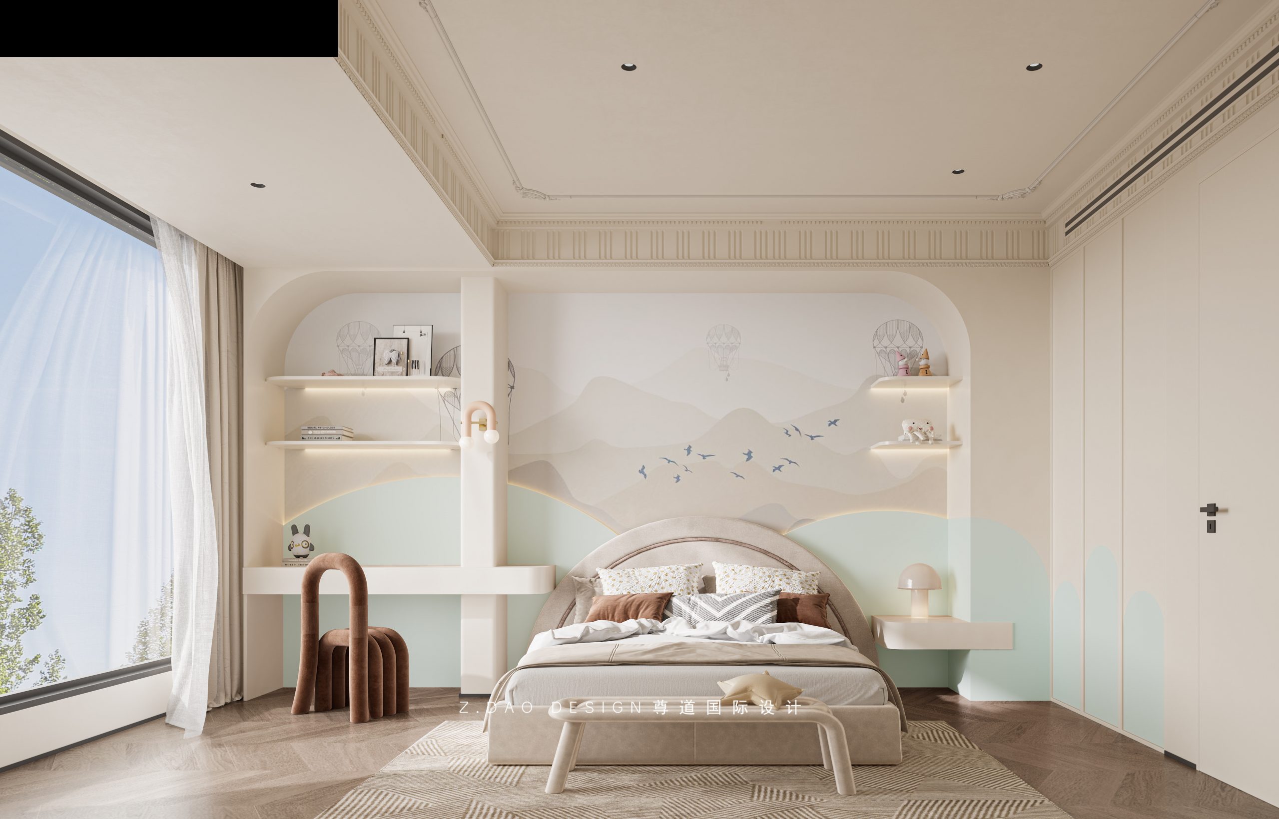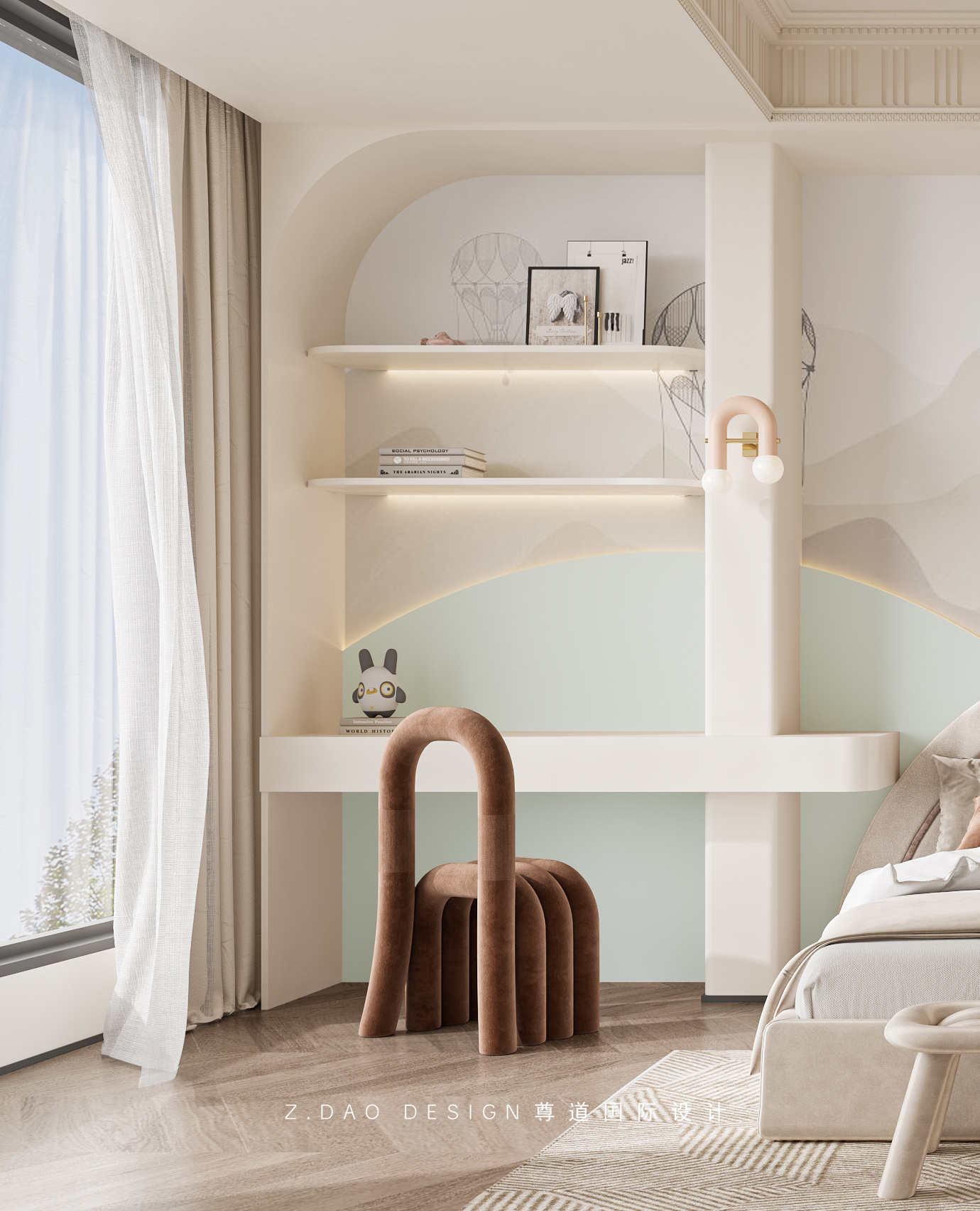床头做开放格,拱形的线条整合了收纳与展示的需求,给予孩子梦幻舒适的学习和成长空间。