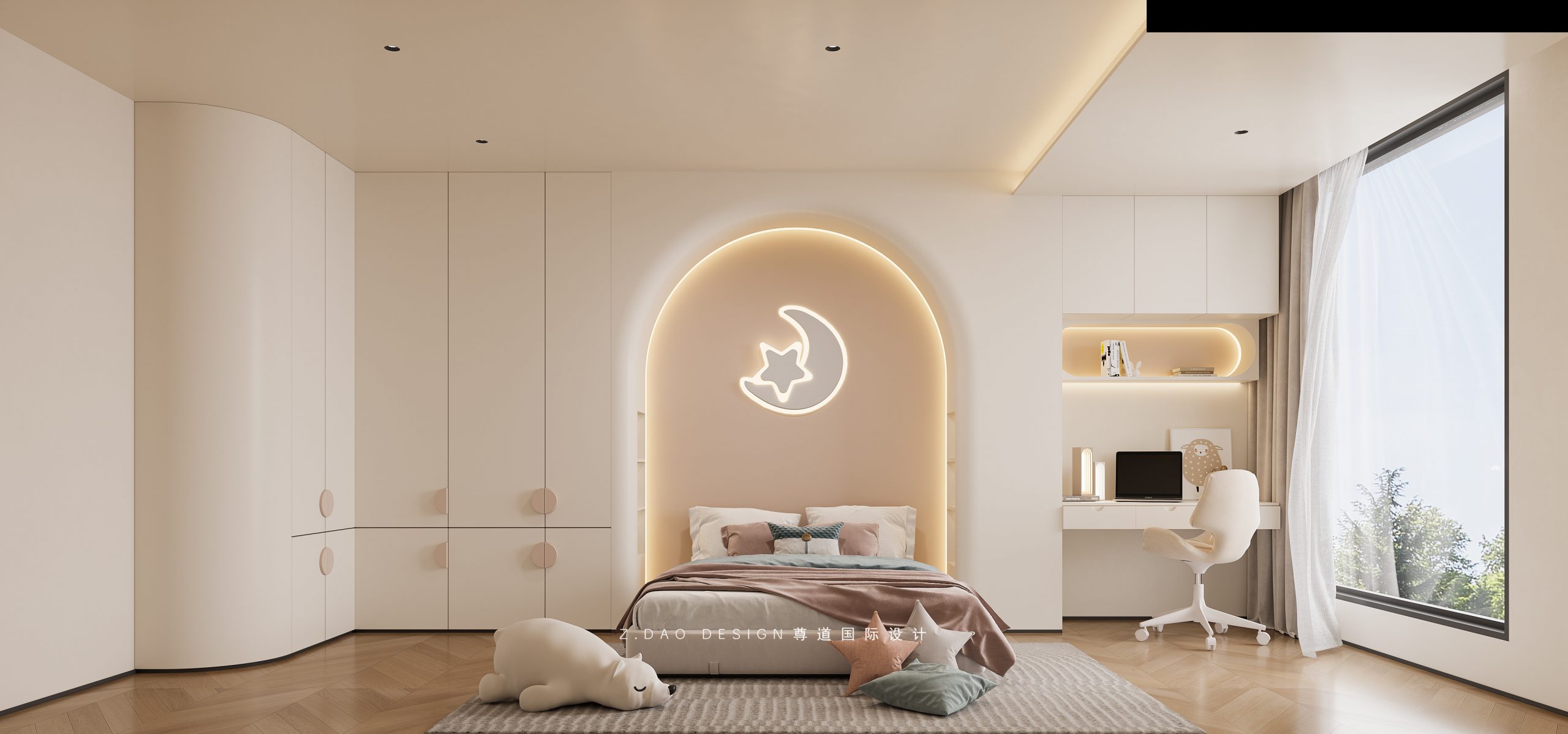 转角跟书桌做了弧度处理,提高房间柔和性。