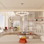 会客厅地面采用人字拼的仿木纹瓷砖,墙顶面同样使用奶油色,软装上搭配选用弧形沙发与弧形茶几。